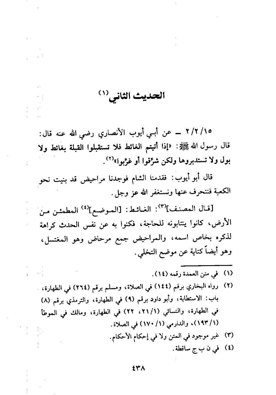 15/ 2/ 2 - عن أبي أيوب الأنصاري رضي الله عنه قال: قال رسول الله - صلى الله عليه وسلم -: "إذا أتيتم الغائط فلا تستقبلوا القبلة بغائط ولا بول ولا تستدبروها ولكن شرِّقوا أو غرِّبوا" (¬2).