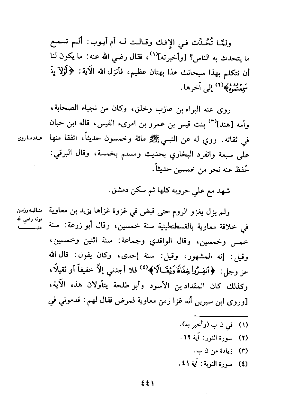 ولم يزل يغزو الروم حتى قبض في غزوة غزاها يزيد بن معاوية في خلافة معاوية بالقسطنطينية سنة خمسين، وقال أبو زرعة: سنة خمس وخمسين، وقال الواقدي وجماعة: سنة اثنين وخمسين، وقل: إنه المشهور، وقيل: سنة إحدى، وكان يقول: قال الله عز وجل: {انْفِرُوا خِفَافًا وَثِقَالًا} (¬4) فلا أجدني إلَّا خفيفًا أو ثقيلًا، وكذلك كان المقداد بن الأسود وأبو طلحة يتأولان هذه الآية،