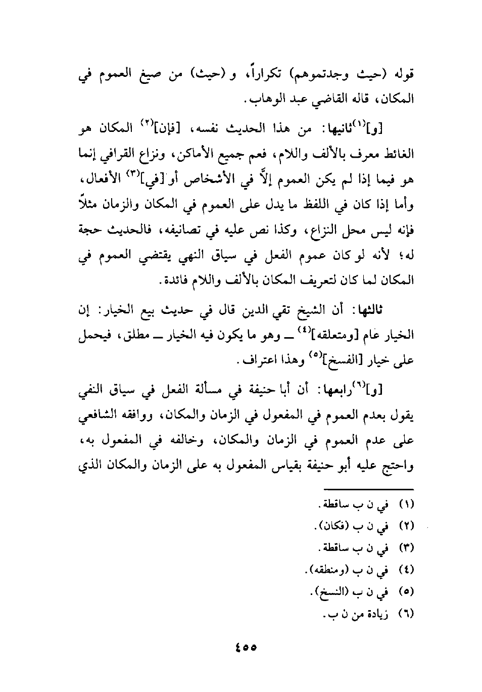 [و] (¬6) رابعها: أن أبا حنيفة في مسألة الفعل في سياق النفي يقول بعدم العموم في المفعول في الزمان والمكان، ووافقه الشافعي على عدم العموم في الزمان والمكان، وخالفه في المفعول به، واحتج عليه أبو حنيفة بقياس المفعول به على الزمان والمكان الذي