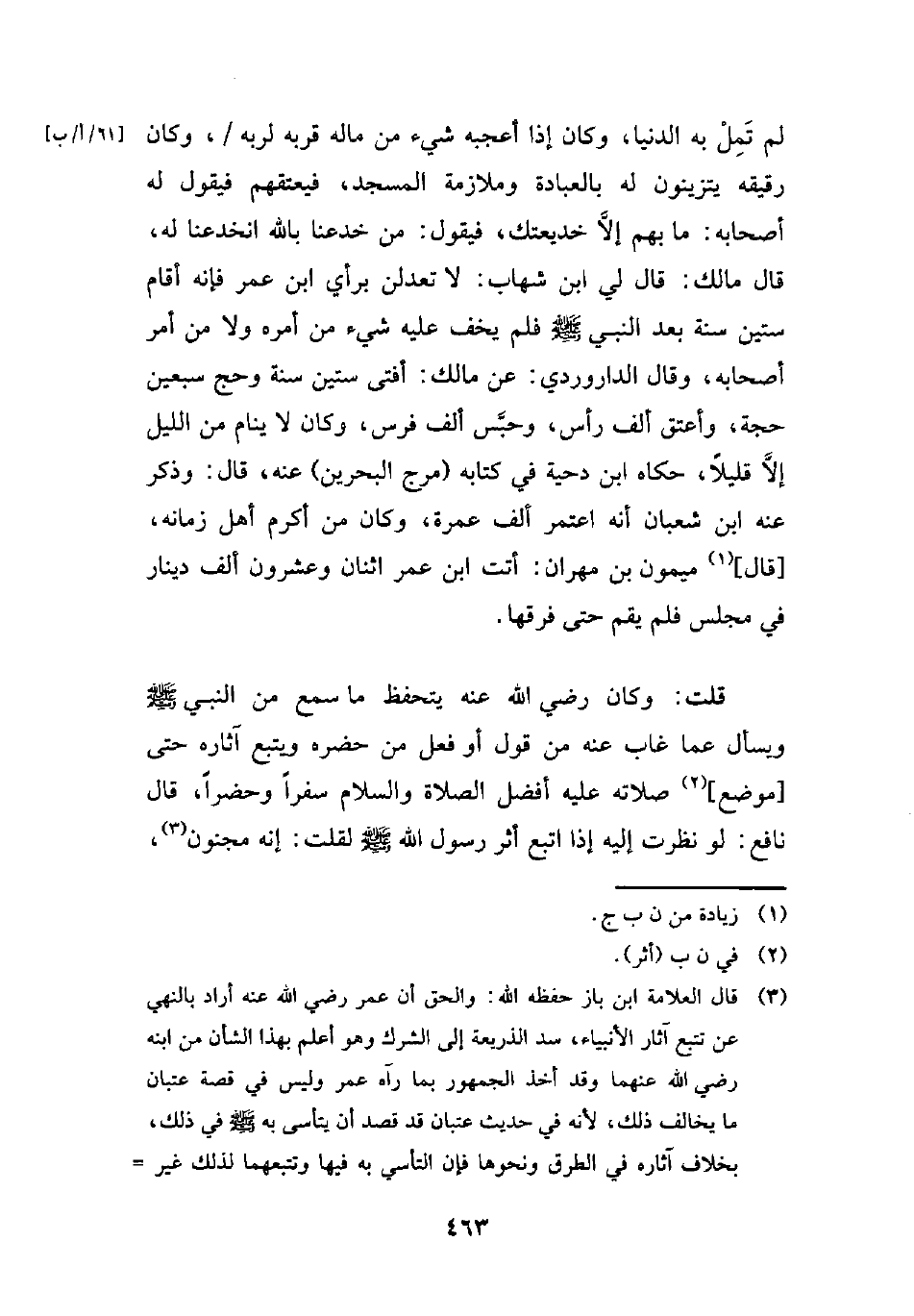 قلت: وكان رضي الله عنه يتحفظ ما سمع من النبي - صلى الله عليه وسلم - ويسأل عما غاب عنه من قول أو فعل من حضره ويتبع آثاره حتى [موضع] (¬2) صلاته عليه أفضل الصلاة والسلام سفرًا وحضرًا، قال نافع: لو نظرت إليه إذا اتبع أثر رسول الله - صلى الله عليه وسلم - لقلت: إنه مجنون (¬3)،