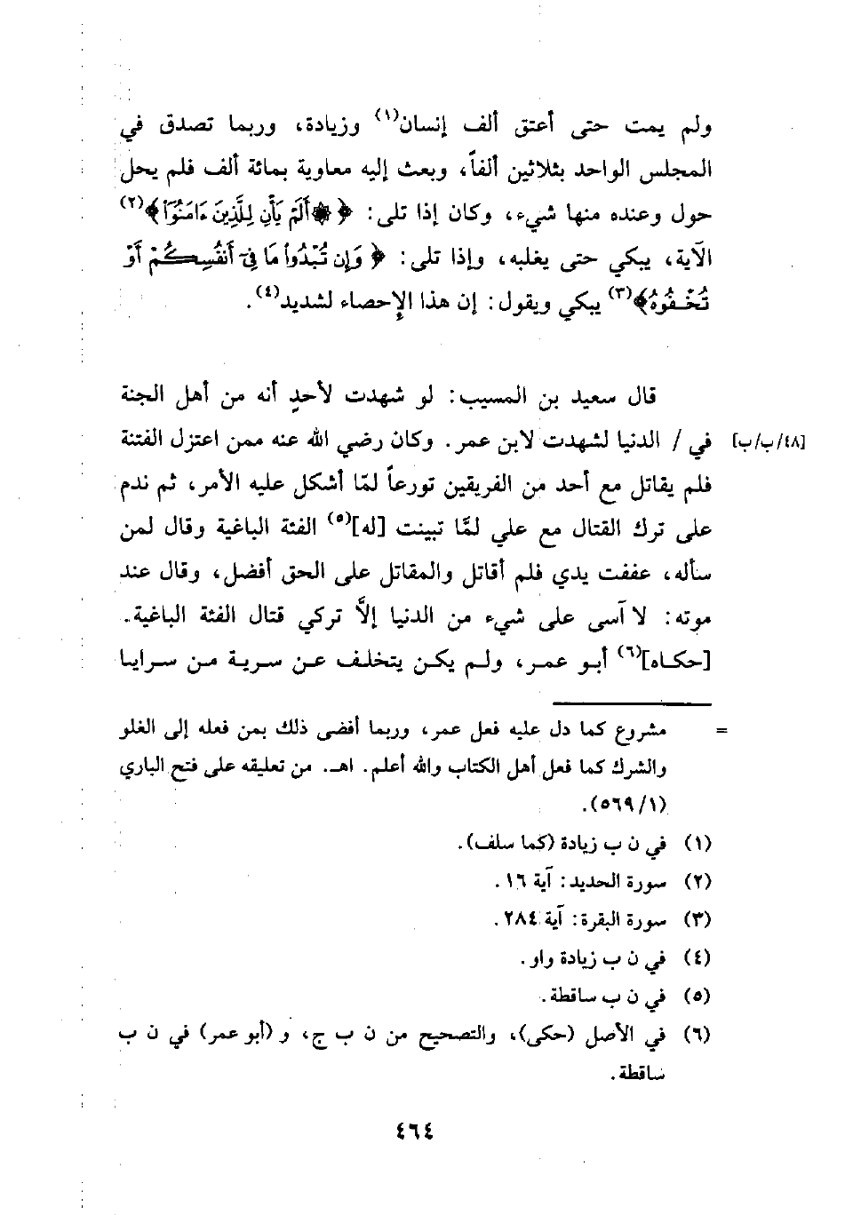 ولم يمت حتى أعتق ألف إنسان (¬1) وزيادة، وربما تصدق في المجلس الواحد بثلاثين ألفًا، وبعث إليه معاوية بمائة ألف فلم يحل حول وعنده منها شيء، وكان إذا تلى: {أَلَمْ يَأْنِ لِلَّذِينَ آمَنُوا} (¬2) الآية، يبكي حتى يغلبه، وإذا تلى: {وَإِنْ تُبْدُوا مَا فِي أَنْفُسِكُمْ أَوْ تُخْفُوهُ} (¬3) يبكي ويقول: إن هذا الإِحصاء لشديد (¬4).