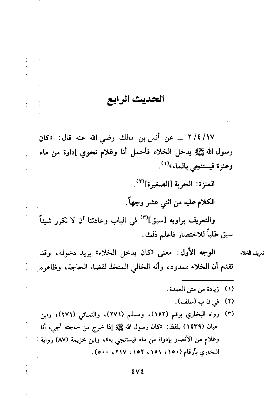(¬3) رواه البخاري برقم (152)، ومسلم (271)، والنسائي (271)، وابن حبان (1439) بلفظ: "كان رسول الله - صلى الله عليه وسلم - إذا خرج من حاجته أجيء أنا وغلام من الأنصار بإدواة من ماء فيستنجي به"، وابن خزيمة (87) رواية البخاري بأرقام (150، 151، 152، 217، 500).