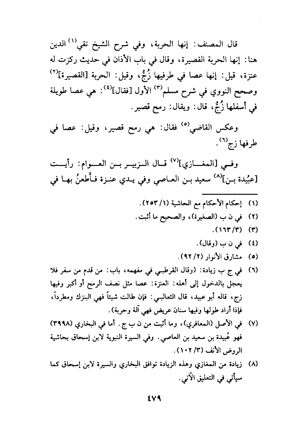 (¬6) في ج ب زيادة: (وقال القرطبي في مفهمه، باب: من قدم من سفر فلا يعجل بالدخول إلى أهله: العنزة: عصا مثل نصف الرمح أو أكبر وفيها زج، قاله أبو عبيد، قال الثعالبي: فإن طالت شيئًا فهي البنزك ومطردًا، فإذا أراد طولها وفيها شأن عريض فهي آلة وحربة).