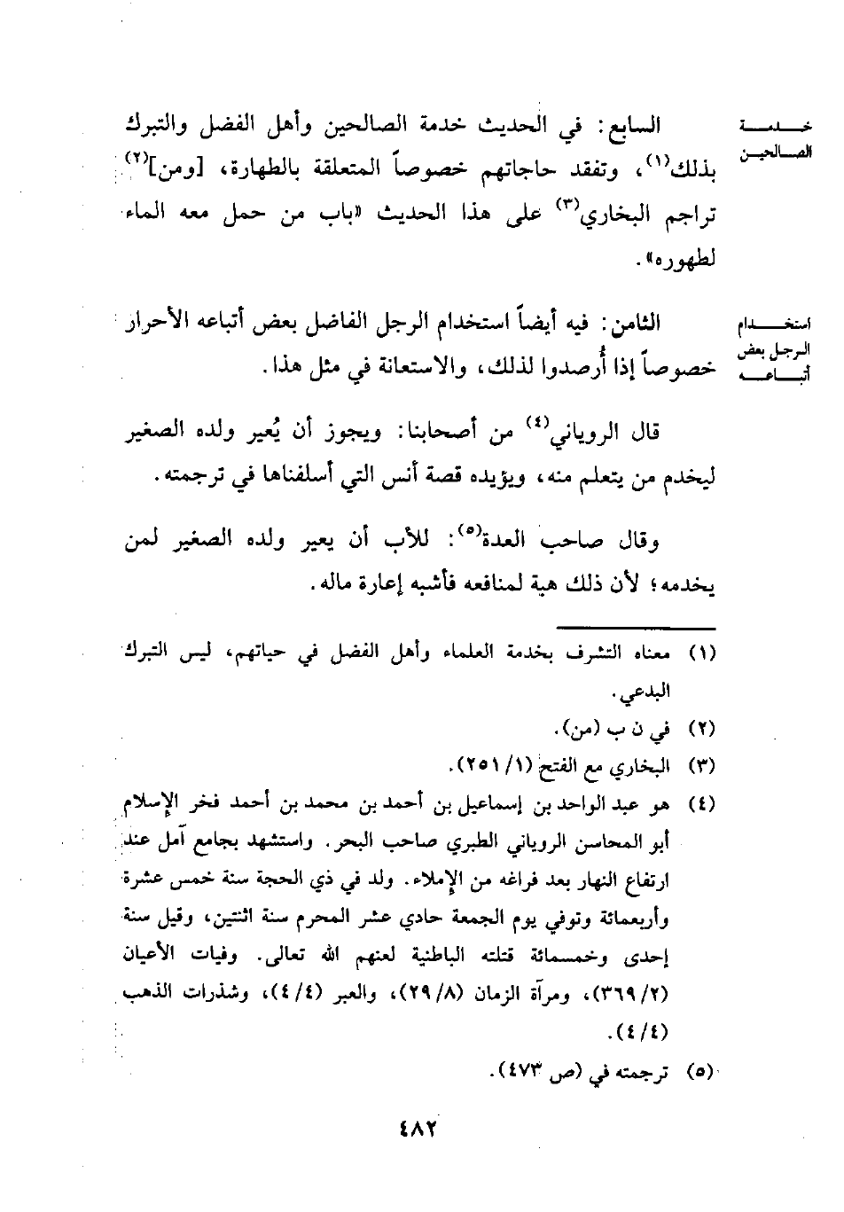 (¬4) هو عبد الواحد بن إسماعيل بن أحمد بن محمد بن أحمد فخر الإِسلام أبو المحاسن الروياني الطبري صاحب البحر. واستشهد بجامع آمل عند ارتفاع النهار بعد فراغه من الإِملاء. ولد في ذي الحجة سنة خمس عشرة وأربعمائة وتوفي يوم الجمعة حادي عشر المحرم سنة اثنتين، وقيل سنة إحدى وخمسمائة قتلته الباطنية لعنهم الله تعالى. وفيات الأعيان (2/ 369)، ومرآة الزمان (8/ 29)، والعبر (4/ 4)، وشذرات الذهب (4/ 4).