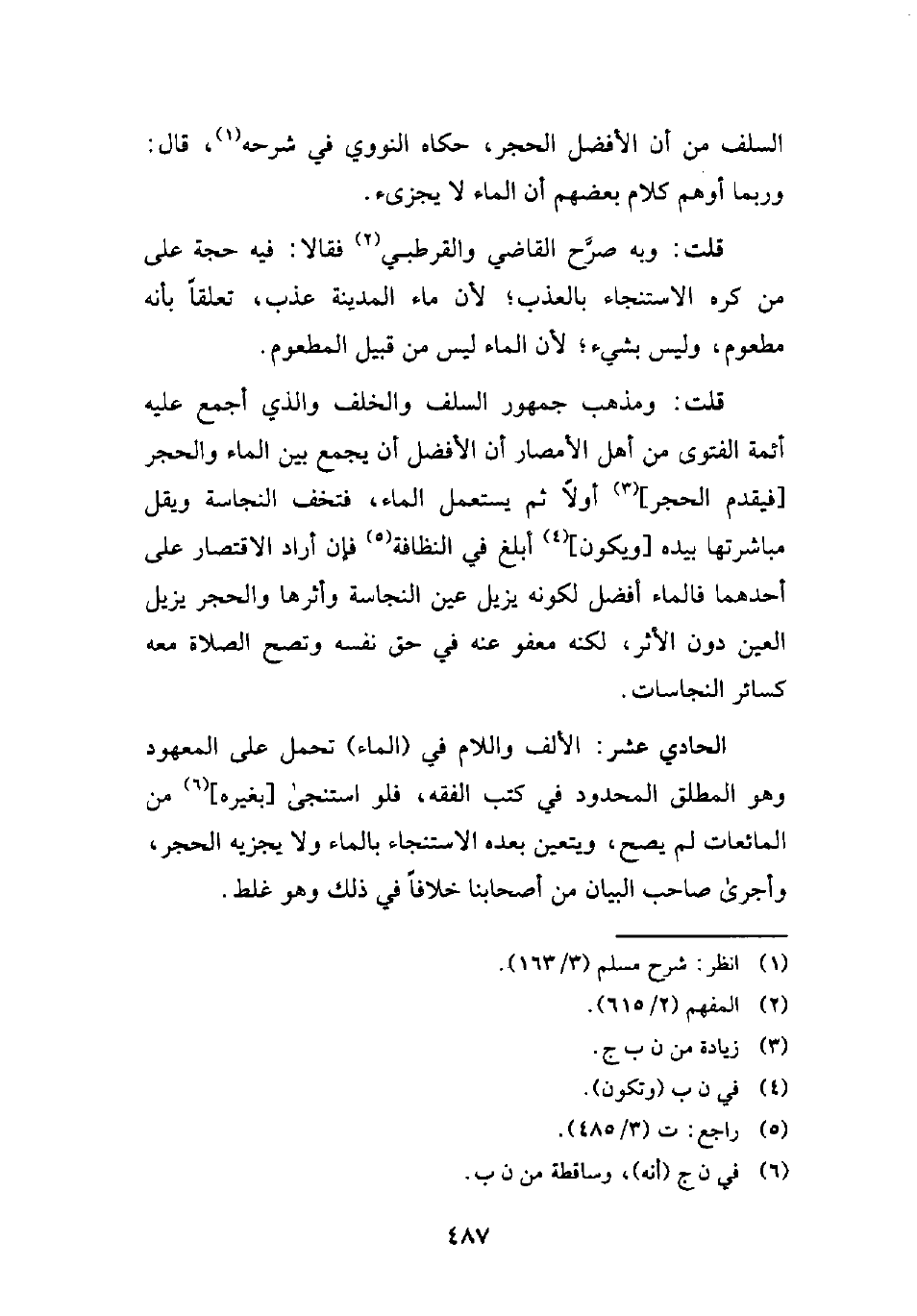 السلف من أن الأفضل الحجر، حكاه النووي في شرحه (¬1)، قال: وربما أوهم كلام بعضهم أن الماه لا يجزئ.