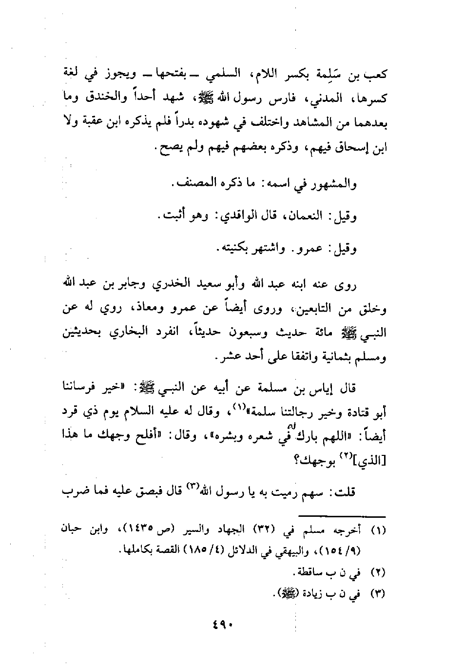 قال إياس بن مسلمة عن أبيه عن النبي - صلى الله عليه وسلم -: "خير فرساننا أبو قتادة وخير رجالتنا سلمة" (¬1)، وقال له عليه السلام يوم ذي قرد أيضًا: "اللهم بارك له في شعره وبشره"، وقال: "أفلح وجهك ما هذا [الذي] (¬2) بوجهك؟
