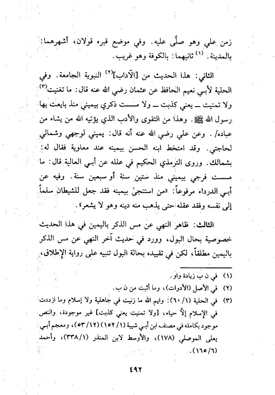 الثاني: هذا الحديث من [الآداب] (¬2) النبوية الجامعة. وفي الحلية لأبي نعيم الحافظ عن عثمان رضي الله عنه قال: ما تغنيت (¬3) ولا تمنيت -يعني كذبت- ولا مسست ذكري بيميني منذ بايعت بها رسول الله - صلى الله عليه وسلم -. وهذا من التقوى والأدب الذي يؤتيه الله من يشاء من عباده. وعن علي رضي الله عنه أنه قال: يميني لوجهي وشمالي لحاجتي. وقد امتخط ابنه الحسن بيمينه عند معاوية فقال له: بشمالك. وروى الترمذي الحكيم في علله عن أبي العالية قال: ما مسست فرجي بيميني منذ ستين سنة أو سبعين سنة. وفيه عن أبي الدرداء مرفوعًا: "من استنجى بيمينه فقد جعل للشيطان سلمًا إلى نفسه وفقد عقله حتى يذهب منه دينه وهو لا يشعر".