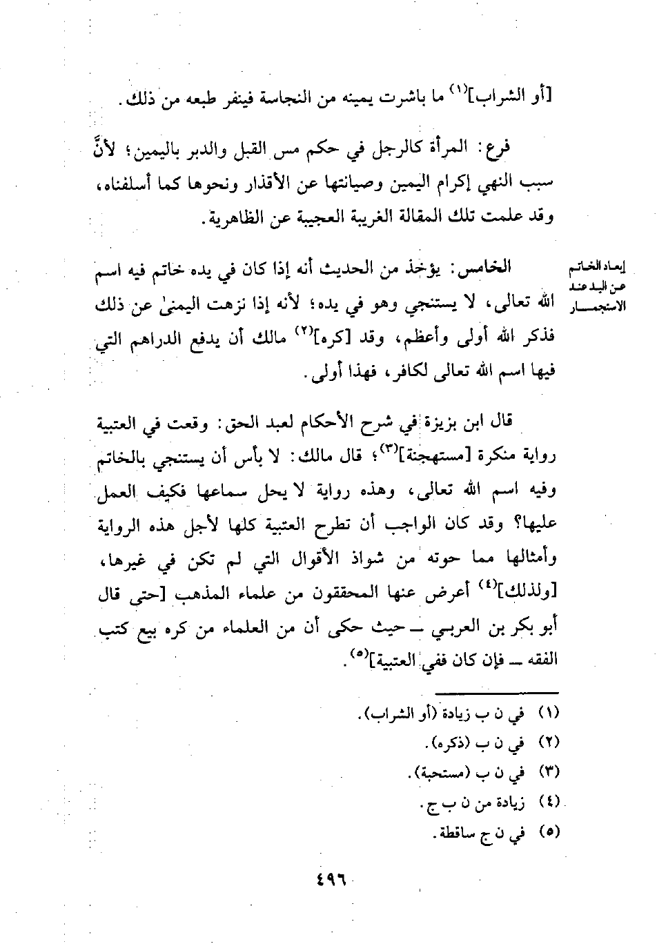 قال ابن بزيزة في شرح الأحكام لعبد الحق: وقعت في العتبية رواية منكرة [مستهجنة] (¬3)؛ قال مالك: لا بأس أن يستنجي بالخاتم وفيه اسم الله تعالى، وهذه رواية لا يحل سماعها فكيف العمل عليها؛ وقد كان الواجب أن تطرح العتبية كلها لأجل هذه الرواية وأمثالها مما حوته من شواذ الأقوال التي لم تكن في غيرها، [ولذلك] (¬4) أعرض عنها المحققون من علماء المذهب [حتى قال أبو بكر بن العربي -حيث حكى أن من العلماء من كره بيع كتب الفقه- فإن كان ففي العتبية] (¬5).