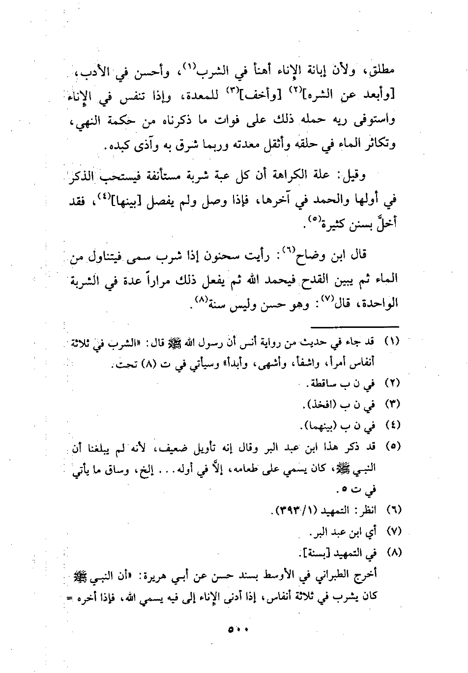 قال ابن وضاح (¬6): رأيت سحنون إذا شرب سمى فيتناول من الماء ثم يبين القدح فيحمد الله ثم يفعل ذلك مرارًا عدة في الشربة الواحدة، قال (¬7): وهو حسن وليس سنة (¬8).