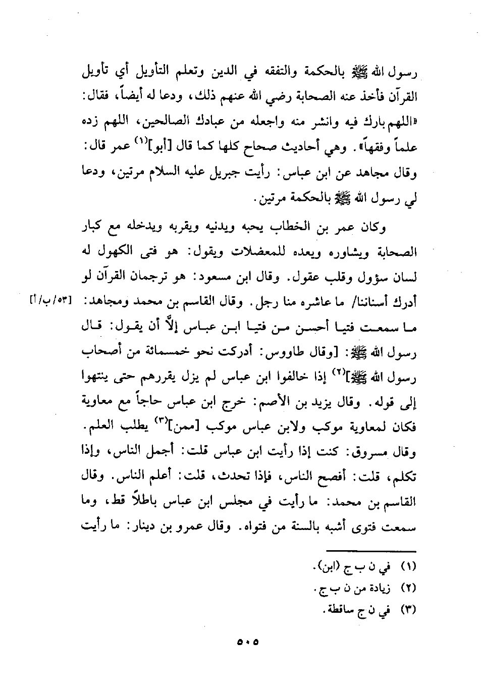 وكان عمر بن الخطاب يحبه ويدنيه ويقربه ويدخله مع كبار الصحابة ويشاوره ويعده للمعضلات ويقول: هو فتى الكهول له لسان سؤول وقلب عقول. وقال ابن مسعود: هو ترجمان القرآن لو أدرك أسناننا ما عاشره منا رجل. وقال القاسم بن محمد ومجاهد: ما سمعت فتيا أحسن من فتيا ابن عباس إلَّا أن يقول: قال رسول الله - صلى الله عليه وسلم -: [وقال طاووس: أدركت نحو خمسمائة من أصحاب رسول الله - صلى الله عليه وسلم -] (¬2) إذا خالفوا ابن عباس لم يزل يقررهم حتى ينتهوا إلى قوله. وقال يزيد بن الأصم: خرج ابن عباس حاجًا مع معاوية فكان لمعاوية موكب ولابن عباس موكب [ممن] (¬3) يطلب العلم. وقال مسروق: كنت إذا رأيت ابن عباس قلت: أجمل الناس، وإذا تكلم، قلت: أفصح الناس، فإذا تحدث، قلت: أعلم الناس. وقال القاسم بن محمد: ما رأيت في مجلس ابن عباس باطلًا قط، وما سمعت فتوى أشبه بالسنة من فتواه. وقال عمرو بن دينار: ما رأيت