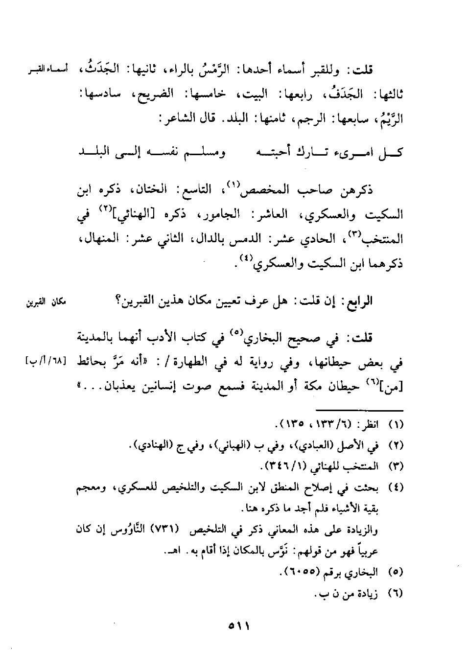 قلت: وللقبر أسماء أحدها: الرَّمْسُ بالراء، ثانيها: الجَدَثُ، ثالثها: الجَدَفُ، رابعها: البيت، خامسها: الضريح، سادسها: الرَّيْمُ، سابعها: الرجم، ثامنها: البلد. قال الشاعر: