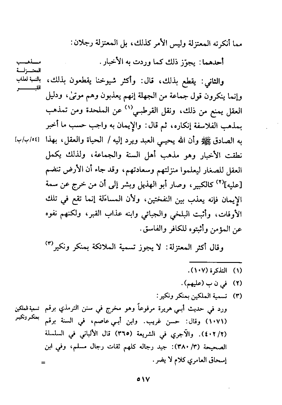 والثاني: يقطع بذلك، قال: وأكثر شيوخنا يقطعون بذلك، وإنما ينكرون قول جماعة سنن الجهلة إنهم يعذبون وهم موتى، ودليل العقل يمنع سنن ذلك، ونقل القرطبي (¬1) عن الملحدة ومن تمذهب بمذهب الفلاسفة إنكاره، ثم قال: والإِيمان به واجب حسب ما أخبر به الصادق - صلى الله عليه وسلم - وأن الله يحيي العبد ويرد إليه الحياة والعقل، بهذا نطقت الأخبار وهو مذهب أهل السنة والجماعة، ولذلك يكمل العقل للصغار ليعلموا منزلتهم وسعادتهم، وقد جاء أن الأرض تنضم [عليه] (¬2) كالكبير، وصار أبو الهذيل وبشر إلى أن سنن خرج عن سمة الإِيمان فإنه يعذب بين النفختين، ولأن المساءَلة إنما تقع في تلك