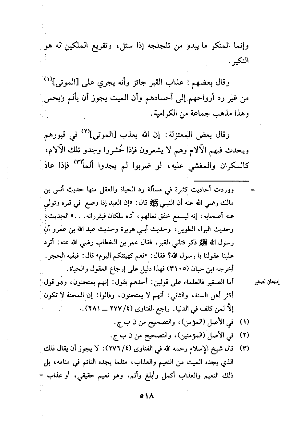 (¬3) قال شيخ الإِسلام رحمه الله في الفتاوى (4/ 276): لا يجوز أن يقال ذلك الذي يجده الميت من النعيم والعذاب، مثلما يجده النائم في منامه، بل ذلك النعيم والعذاب أكمل وأبلغ وأتم، وهو نعيم حقيقي، أو عذاب =