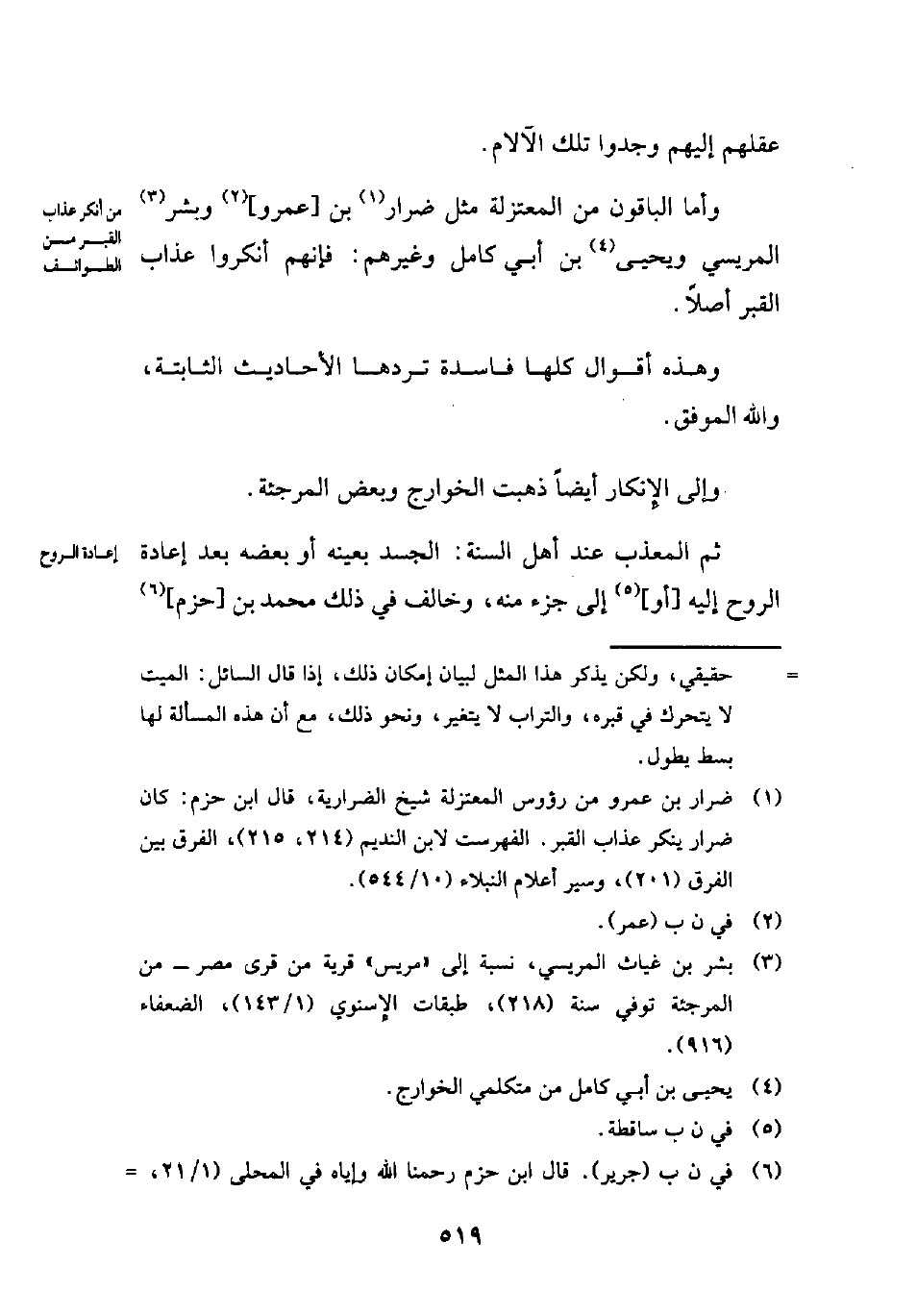 (¬1) ضرار بن عمرو من رؤوس المعتزلة شيخ الضرارية، قال ابن حزم: كان ضرار ينكر عذاب القبر. الفهرست لابن النديم (214، 215)، الفرق بين الفرق (201)، وسير أعلام النبلاء (10/ 544).