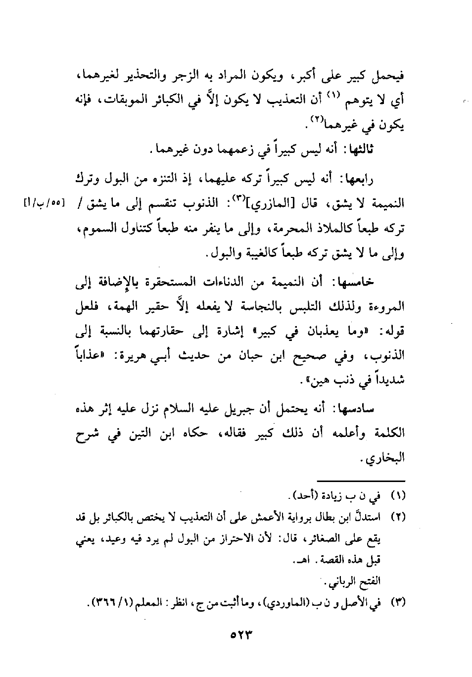 رابعها: أنه ليس كبيرًا تركه عليهما، إذ التنزه من البول وترك النميمة لا يشق، قال [المازري] (¬3): الذنوب تنقسم إلى ما يشق تركه طبعًا كالملاذ المحرمة، وإلى ما ينفر منه طبعًا كتناول السموم، وإلى ما لا يشق تركه طبعًا كالغيبة والبول.