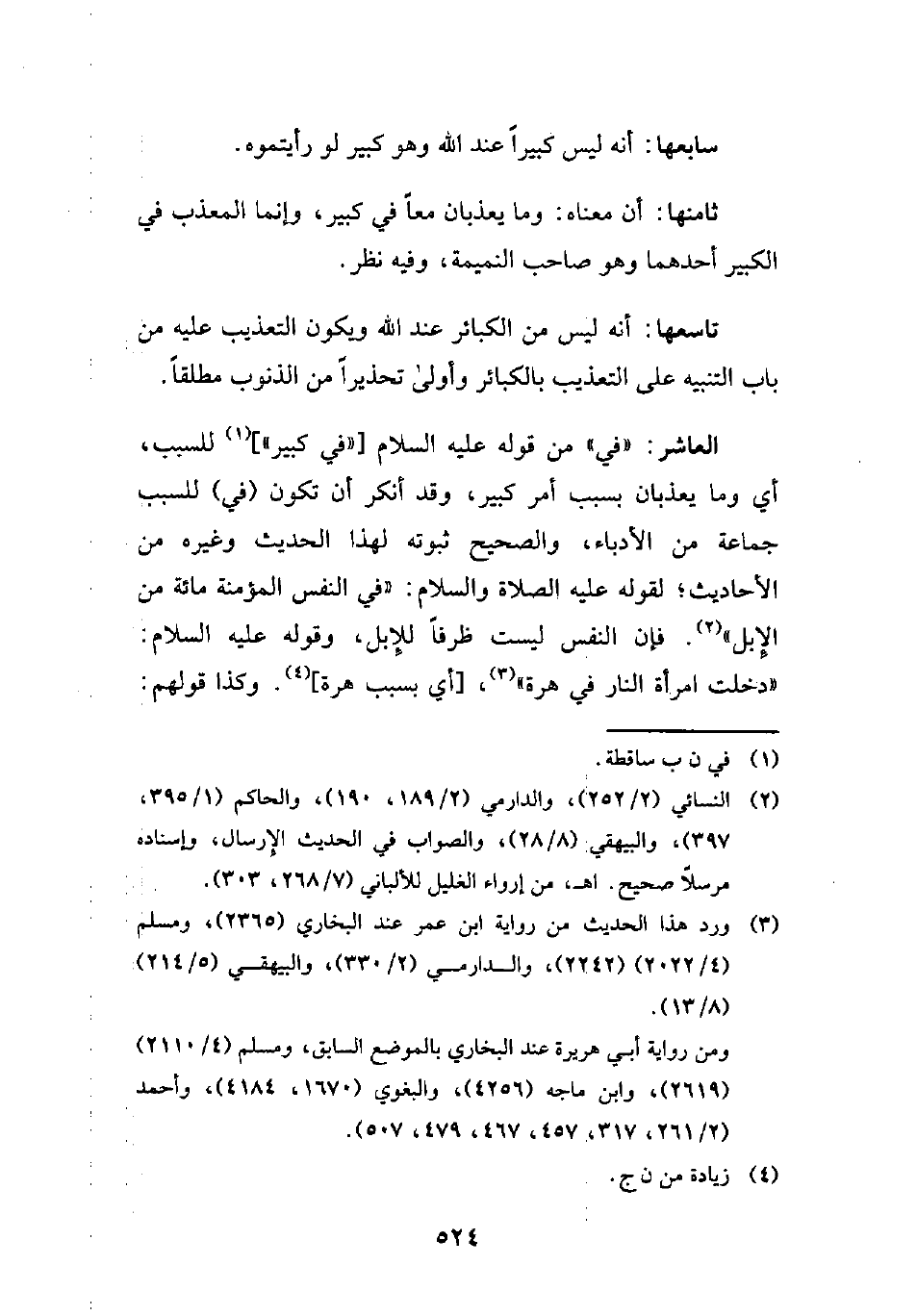 العاشر: "في" من قوله عليه السلام ["في كبير"] (¬1) للسبب، أي وما يعذبان بسبب أمر كبير، وقد أنكر أن تكون (في) للسبب جماعة من الأدباء، والتصحيح ثبوته لهذا الحديث وغيره من الأحاديث؛ لقوله عليه الصلاة والسلام: "في النفس المؤمنة مائة من الإِبل" (¬2). فإن النفس ليست ظرفًا للإِبل، وقوله عليه السلام: "دخلت امرأة النار في هرة" (¬3) [أي بسبب هرة] (¬4). وكذا قولهم:
