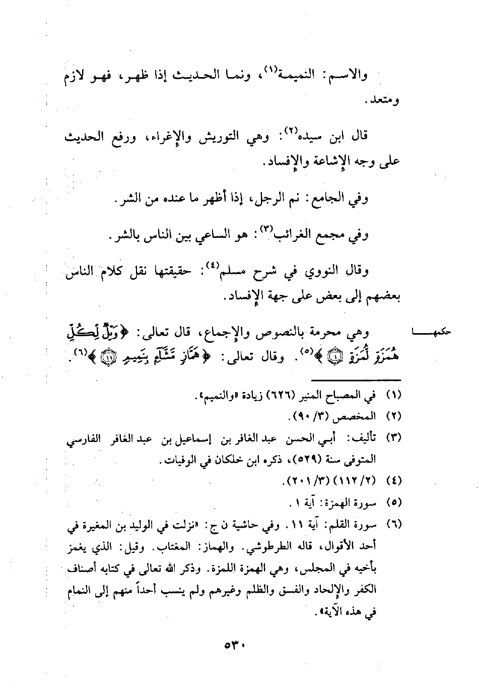 (¬6) سورة القلم: آية 11. وفي حاشية ن ج: "نزلت في الوليد بن المغيرة في أحد الأقوال، قاله الطرطوشي. والهماز: المغتاب. وقيل: الذي يغمز بأخيه في المجلس، وهي الهمزة اللمزة. وذكر الله تعالى في كتابه أصناف الكفر والإِلحاد والفسق والظلم وغيرهم ولم ينسب أحدًا منهم إلى النمام في هذه الآية".