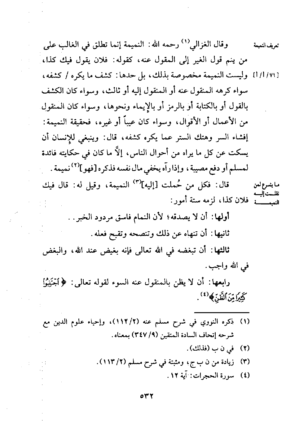 قال: فكل من حُملت [إليه] (¬3) النميمة، وقيل له: قال فيك فلان كذا، لزمه ستة أمور: