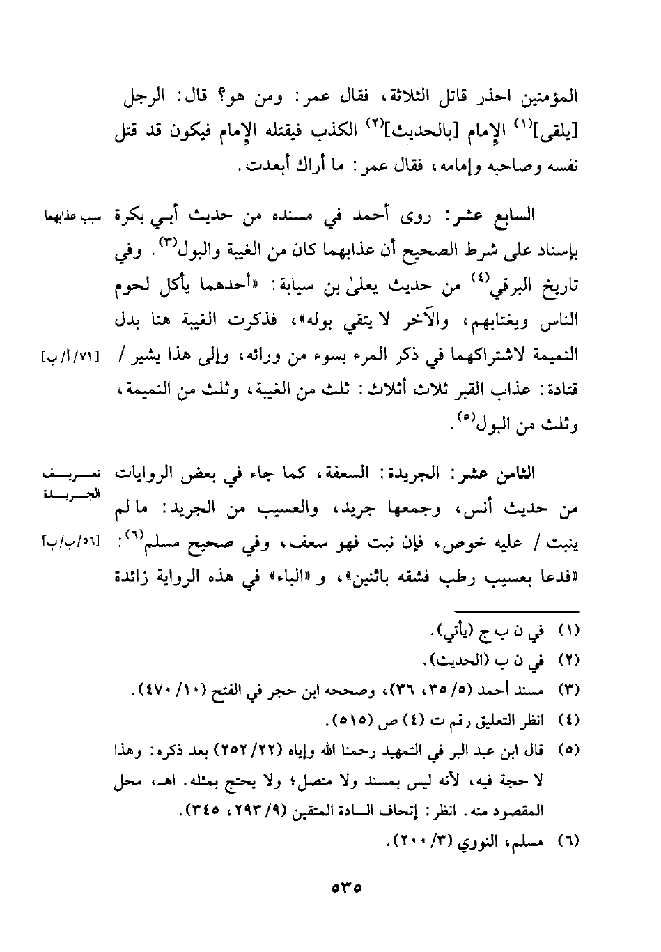 السابع عشر: روى أحمد في مسنده من حديث أبي بكرة بإسناد على شرط الصحيح أن عذابهما كان من الغيبة والبول (¬3). وفي تاريخ البرقي (¬4) من حديث يعلى بن سيابة: "أحدهما يأكل لحوم الناس ويغتابهم، والآخر لا يتقي بوله"، فذكرت الغيبة هنا بدل النميمة لاشتراكهما في ذكر المرء بسوء من ورائه، وإلى هذا يشير قتادة: عذاب القبر ثلاث أثلاث: ثلث من الغيبة، وثلث من النميمة، وثلث من البول (¬5).