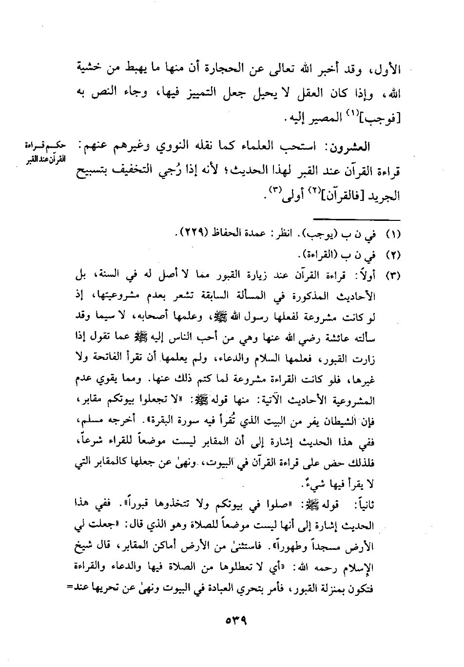 (¬3) أولًا: قراءة القرآن عند زيارة القبور مما لا أصل له في السنة، بل الأحاديت المذكورة في المسألة السابقة تشعر بعدم مشروعيتها، إذ لو كانت مشروعة لفعلها رسول الله - صلى الله عليه وسلم -، وعلمها أصحابه، لا سيما وقد سألته عائشة رضي الله عها وهي من أحب الناس اليه - صلى الله عليه وسلم - عما تقول إذا زارت القبور، فعلمها السلام والدعاء، ولم يعلمها أن تقرأ الفاتحة ولا غيرها، فلو كانت القراءة مشروعة لما كتم ذلك عنها. ومما يقوي عدم المشروعية الأحاديث الآتية: منها قوله - صلى الله عليه وسلم -: "لا تجعلوا بيوتكم مقابر، فإن الشيطان يفر من البيت الذي تُقرأ فيه سورة البقرة". أخرجه مسلم، ففي هذا الحديث إشارة إلى أن المقابر ليست موضعًا للقراء شرعًا، فلذلك حض على قراءة القرآن في البيوت، ونهى عن جعلها كالمقابر التي لا يقرأ فيها شيءٌ.