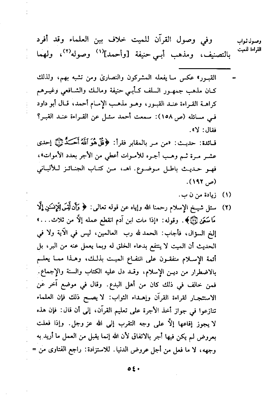 (¬2) سئل شيخ الإِسلام رحمنا الله وإياه عن قوله تعالى: {وَأَنْ لَيْسَ لِلْإِنْسَانِ إِلَّا مَا سَعَى (39)}. وقوله: "إذا مات ابن آدم انقطع عمله إلَّا من ثلاث ... " إلخ السؤال، فأجاب: الحمد لله رب العالمين، ليس في الآية ولا في الحديث أن الميت لا ينتفع بدعاء الخلق له وبما يعمل عنه من البر، بل أئمة الإِسلام متفقون على انتفاع الميت بذلك، وهذا مما يعلم بالاضطرار من دين الإِسلام، وقد دل عليه الكتاب والسنة والإِجماع. فمن خالف في ذلك كان من أهل البدع. وقال في موضع آخر عن الاستئجار لقراءة القرآن وإهداء الثواب: لا يصح ذلك فإن العلماء تنازعوا في جواز أخذ الأجرة على تعليم القرآن، إلى أن قال: فإن هذه لا يجوز إقاعها إلَّا على وجه التقرب إلى الله عز وجل. وإذا فعلت بعروض لم يكن فيها أجر بالاتفاق لأن الله إنما يقبل من العمل ما أريد به وجهه، لا ما فعل من أجل عروض الدنيا. للاستزادة: راجع الفتاوى من =