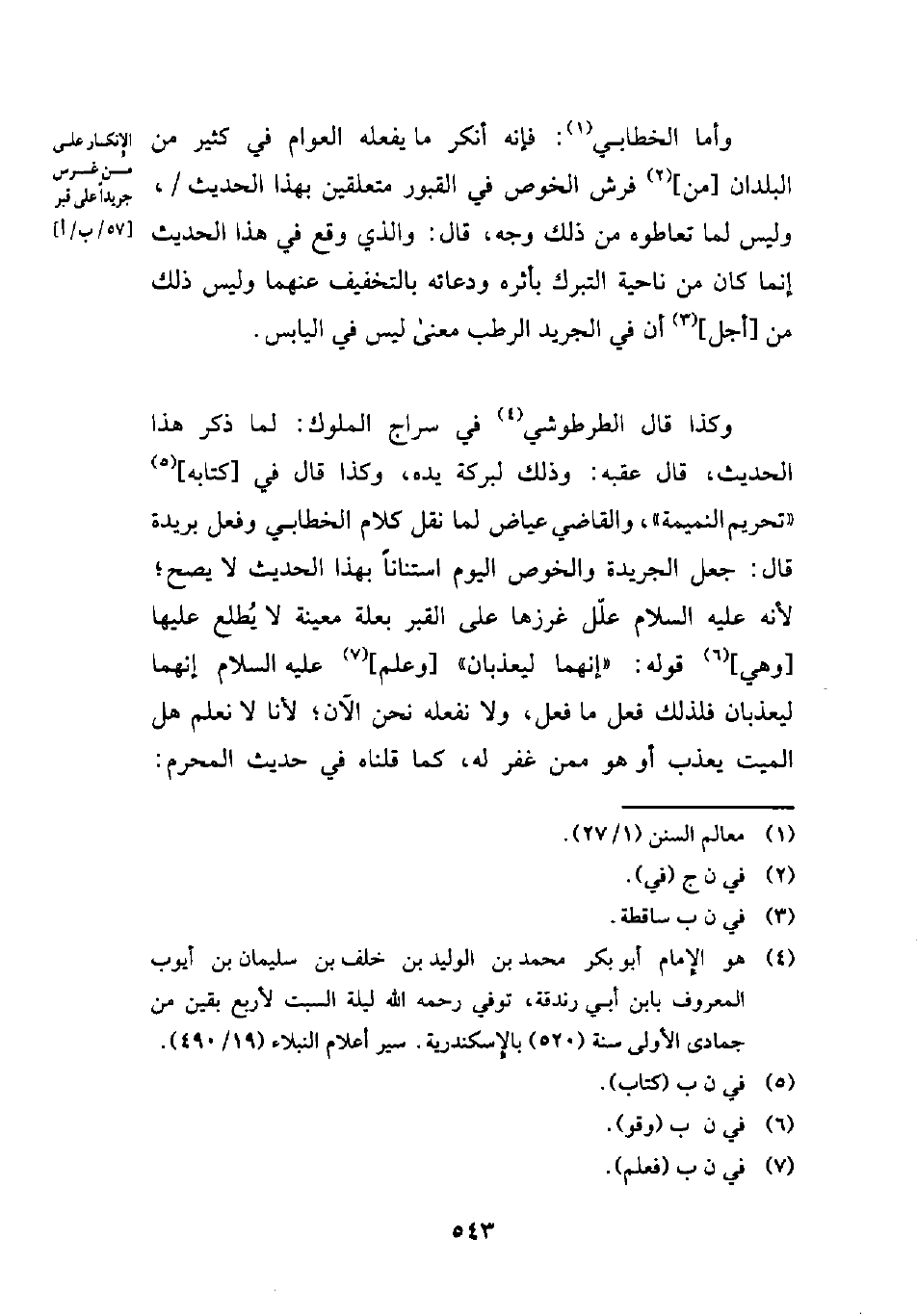 (¬4) هو الإِمام أبو بكر محمد بن الوليد بن خلف بن سليمان بن أيوب المعروف بابن أبي رندقة، توفي رحمه الله ليلة السبت لأربع بقين من جمادى الأولى سنة (520) بالإِسكندرية. سير أعلام النبلاء (19/ 490).
