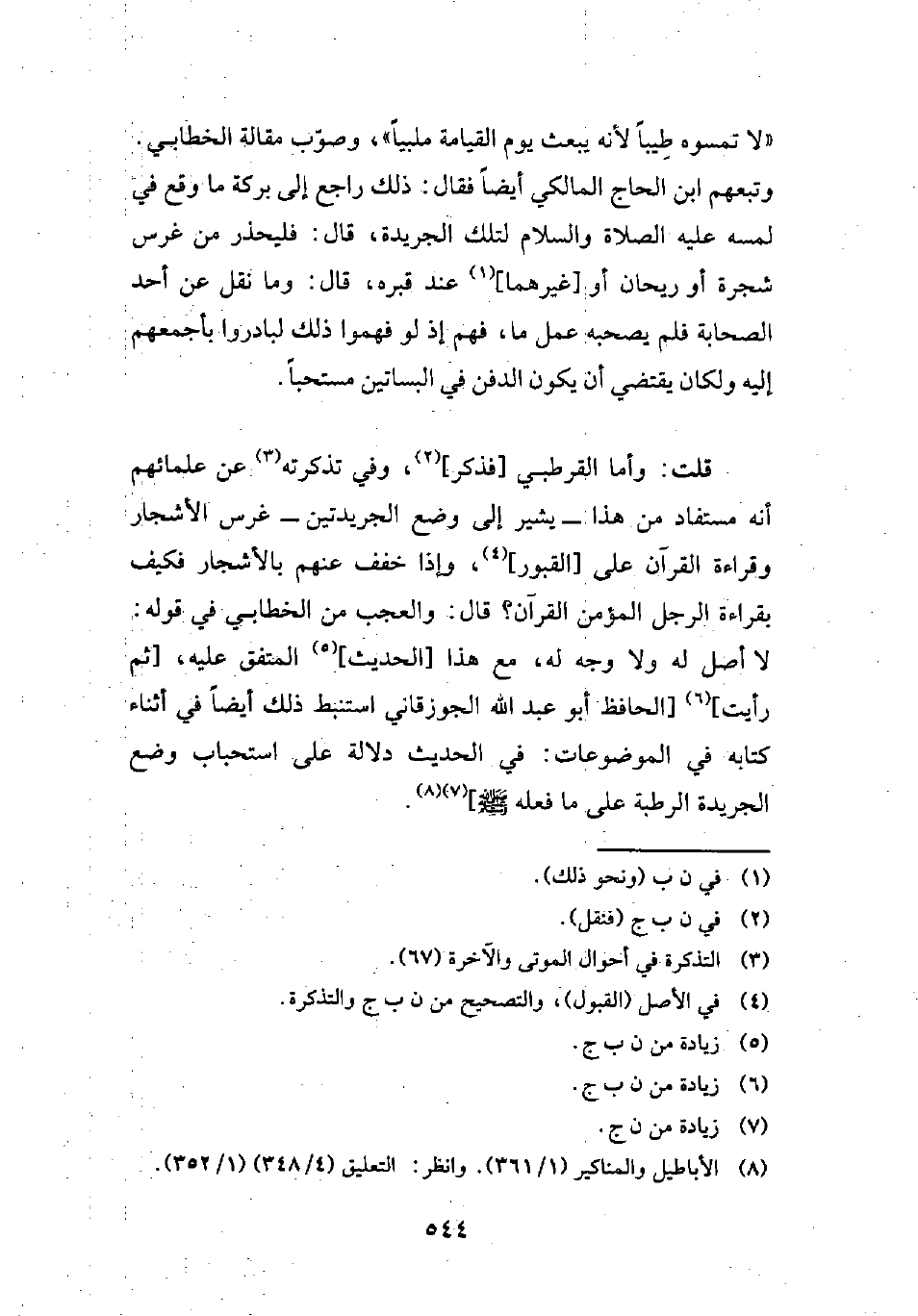 "لا تمسوه طِيبًا لأنه يبعث يوم القيامة ملبيًا"، وصوّب مقالة الخطابي. وتبعهم ابن الحاج المالكي أيضًا فقال: ذلك راجع إلى بركة ما وقع في لمسه عليه الصلاة والسلام لتلك الجريدة، قال: فليحذر من غرس شجرة أو ريحان أو [غيرهما] (¬1) عند قبره، قال: وما نقل عن أحد الصحابة فلم يصحبه عمل ما، فهم إذ لو فهموا ذلك لبادروا بأجمعهم إليه ولكان يقتضي أن يكون الدفن في البساتين مستحبًا.