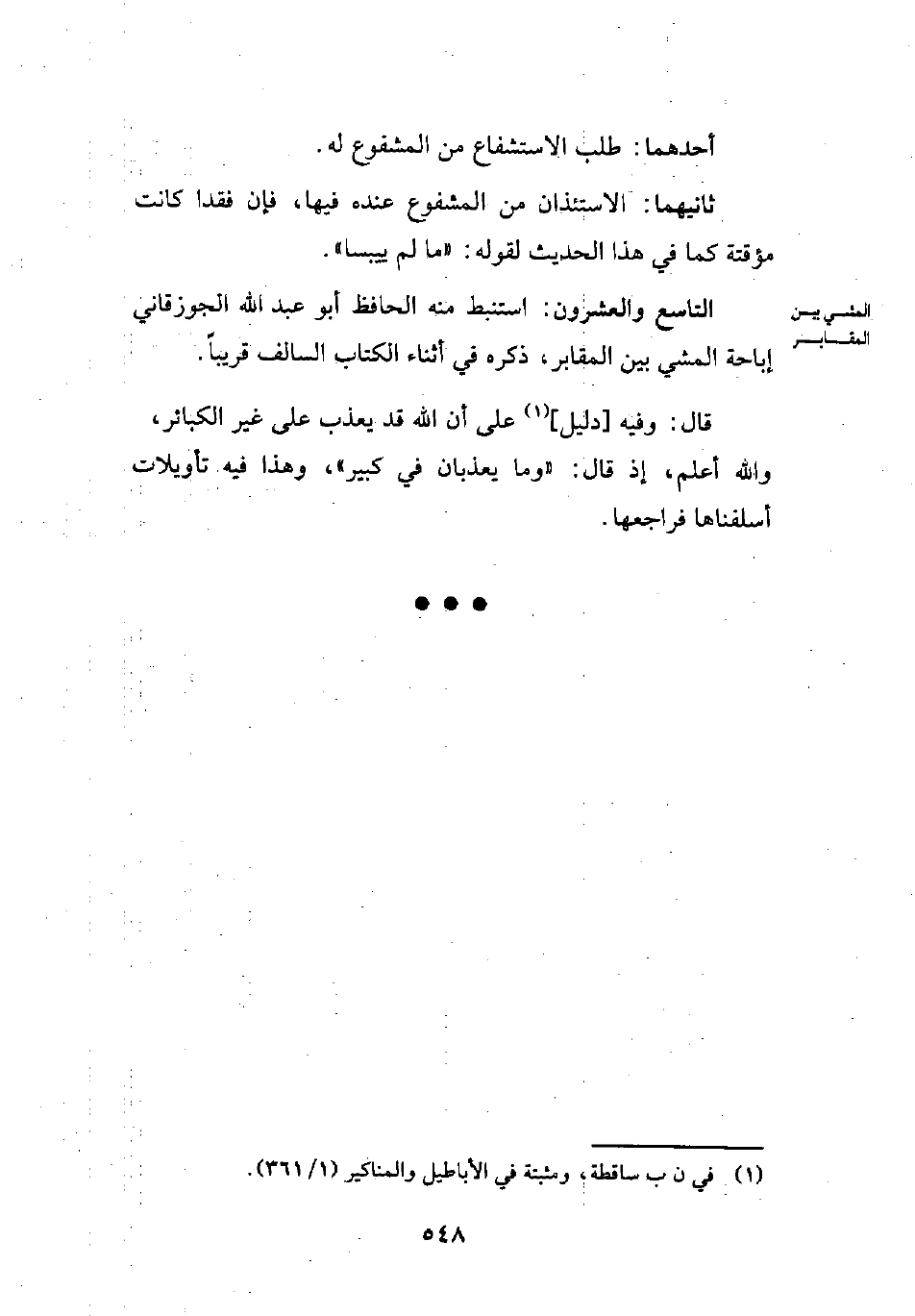 التاسع والعشرون: استنبط منه الحافظ أبو عبد الله الجوزقاني إباحة المشي بين المقابر، ذكره في أثناء الكتاب السالف قريبًا.