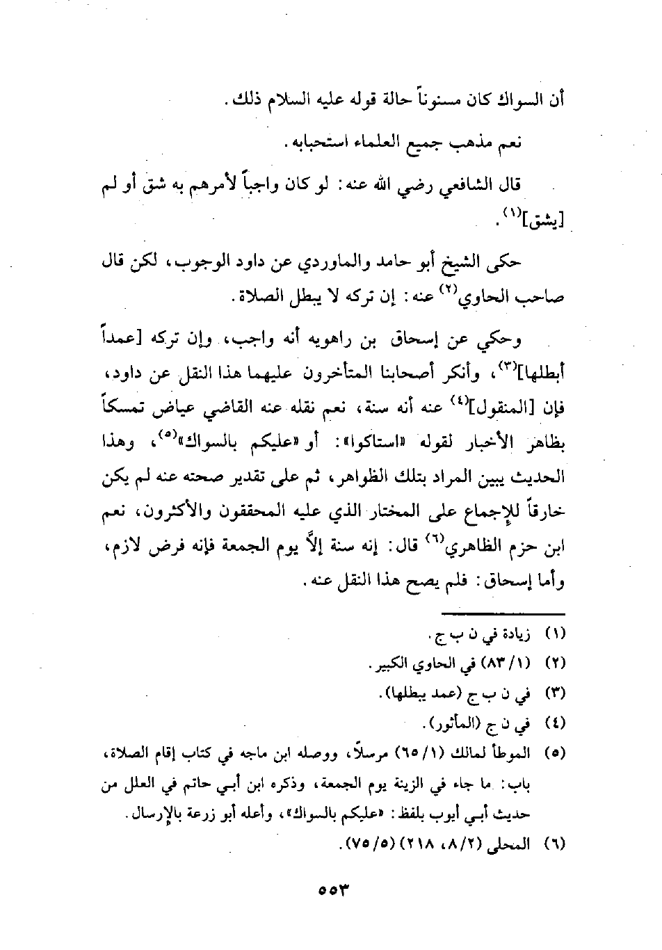 وحكي عن إسحاق بن راهويه أنه واجب، وإن تركه [عمدًا أبطلها] (¬3)، وأنكر أصحابنا المتأخرون عليهما هذا النقل عن داود، فإن [المنقول] (¬4) عنه أنه سنة، نعم نقله عنه القاضي عياض تمسكًا بظاهر الأخبار لقوله "استاكوا": أو "عليكم بالسواك" (¬5)، وهذا الحديث يبين المراد بتلك الظواهر، ثم على تقدير صحته عنه لم يكن خارقًا للإِجماع على المختار الذي عليه المحققون والأكثرون، نعم ابن حزم الظاهري (¬6) قال: إنه سنة إلَّا يوم الجمعة فإنه فرض لازم، وأما إسحاق: فلم يصح هذا النقل عنه.