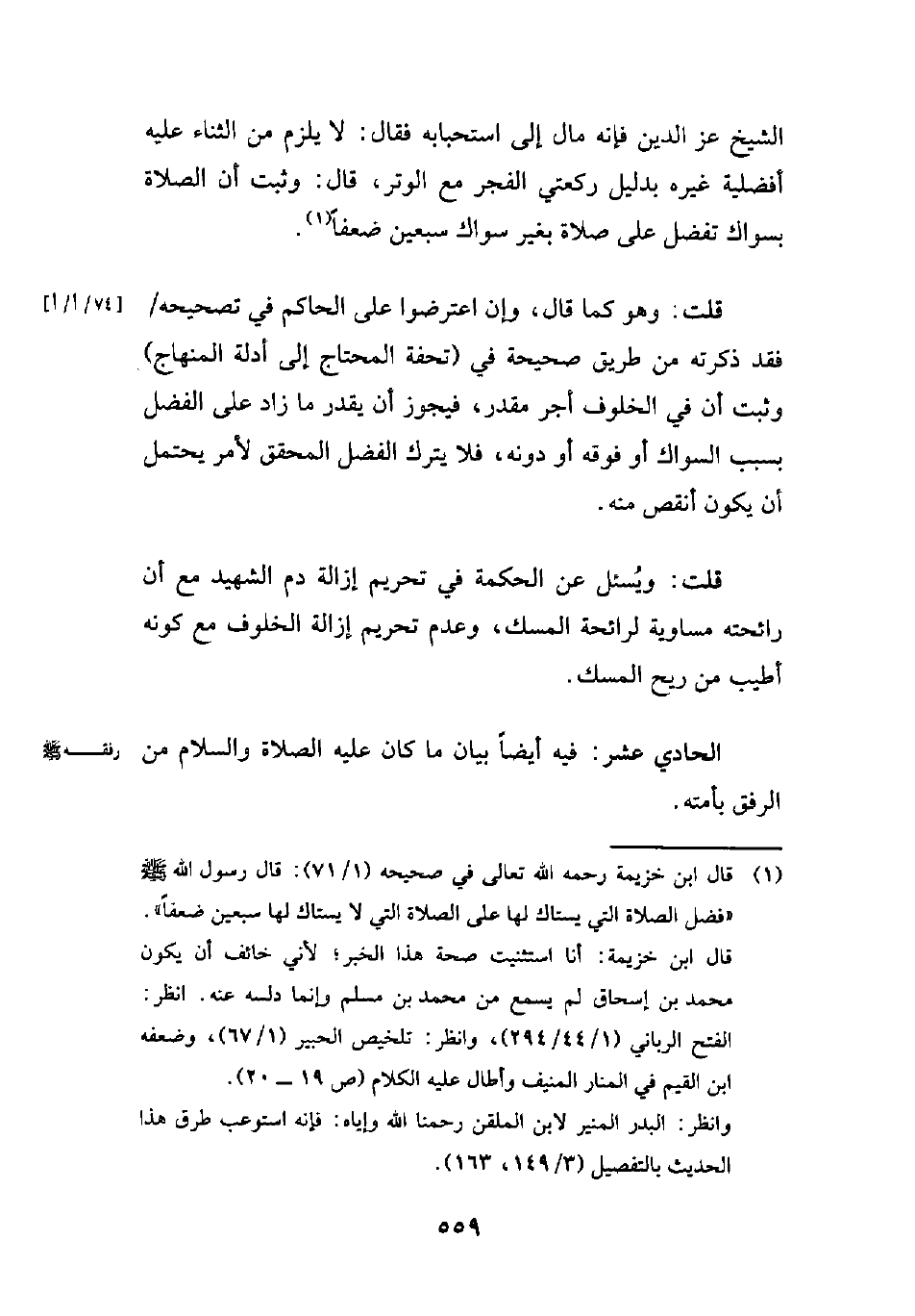 (¬1) قال ابن خزيمة رحمه الله تعالى في صحيحه (1/ 71): قال رسول الله - صلى الله عليه وسلم - "فضل الصلاة التي يستاك لها على الصلاة التي لا يستاك لها سبعين ضعفًا". قال ابن خزيمة: أنا استثنيت صحة هذا الخبر؛ لأني خائف أن يكون محمد بن إسحاق لم يسمع من محمد بن مسلم وإنما دلسه عنه. انظر: الفتح الرباني (1/ 44/ 294)، وانظر: تلخيص الحبير (1/ 67)، وضعفه ابن القيم في المنار المنيف وأطال عليه الكلام (ص 19 - 20).
