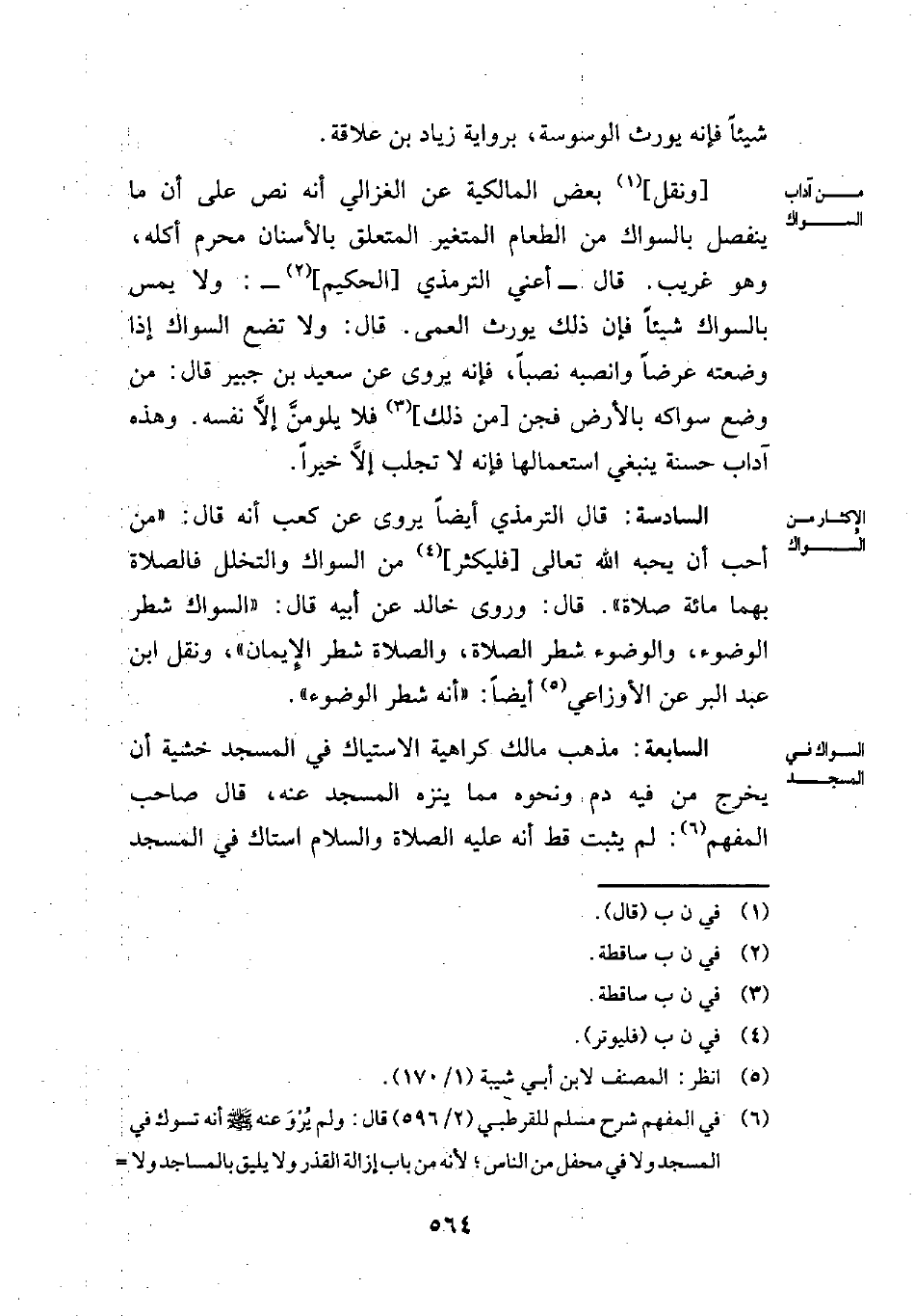 (¬6) في المفهم شرح مسلم للقرطبي (2/ 596) قال: ولم يُرْوَ عنه - صلى الله عليه وسلم - أنه تسوك في المسجد ولا في محفل من الناس؛ لأنه منه من باب إزالة القذر ولا يليق بالمساجد ولا =