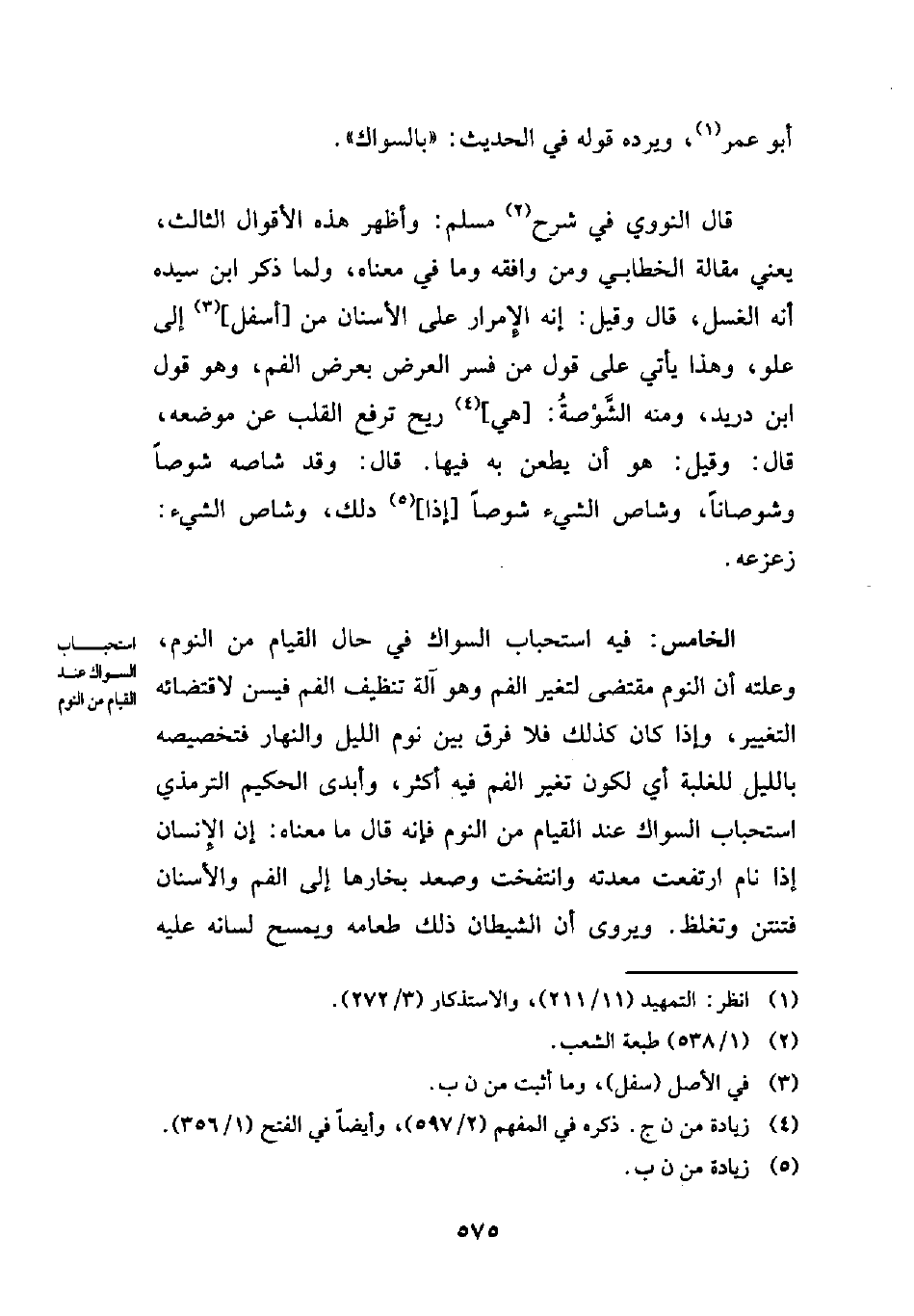 الخامس: فيه استحباب السواك في حال القيام من النوم، وعلته أن النوم مقتضى لتغير الفم وهو آلة تنظيف الفم فيسن لاقتضائه التغيير، وإذا كان كذلك فلا فرق بين نوم الليل والنهار فتخصيصه بالليل للغلبة أي لكون تغير الفم فيه أكثر، وأبدى الحكيم الترمذي استحباب السواك عند القيام من النوم فإنه قال ما معناه: إن الإِنسان إذا نام ارتفعت معدته وانتفخت وصعد بخارها إلى الفم والأسنان فتنتن وتغلظ. ويروى أن الشيطان ذلك طعامه ويمسح لسانه عليه