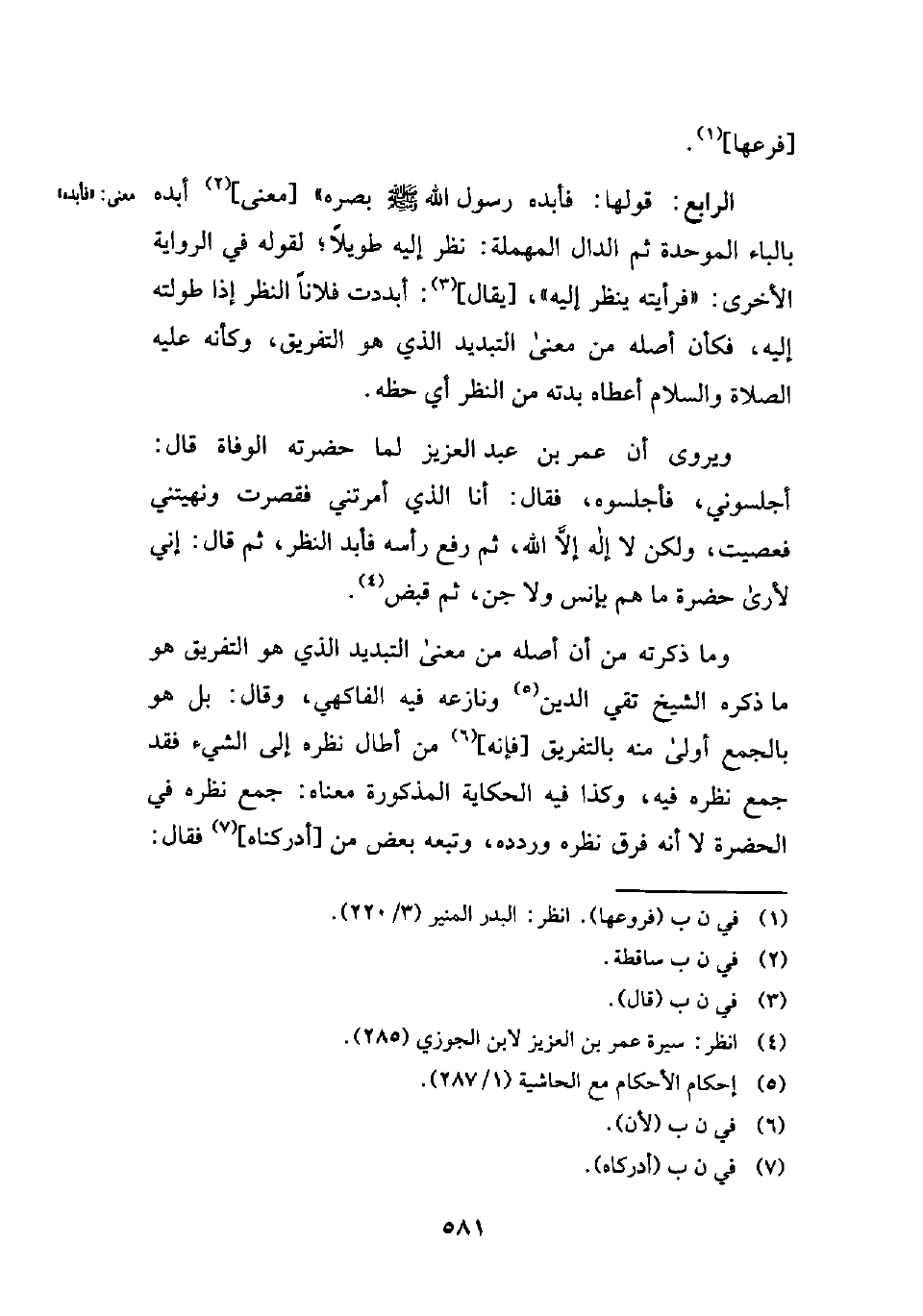 الرابع: قولها: فأبده رسول الله - صلى الله عليه وسلم - بصره [معنى] (¬2) أيده بالباء الموحدة ثم الدال المهملة: نظر إليه طويلًا؛ لقوله في الرواية الأخرى: "فرأيته ينظر إليه"، [يقال] (¬3): أبددت فلانًا النظر إذا طولته إليه، فكان أصله من معنى التبديد الذي هو التفريق، وكأنه عليه الصلاة والسلام أعطاه بدته من النظر أي حظه.