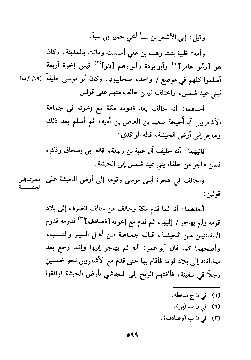 أحدهما: أنه لما قدم مكة وحالف من حالف انصرف إلى بلاد قومه ولم يهاجر إليها، ثم قدم مع إخوته [فصادف] (¬3) قدومه قدوم السفينتين من الحبشة، قاله جماعة من أهل السير والنسب، وأصحهما كما قال أبو عمر: أنه لم يهاجر إليها وإنما رجع بعد مخالفته إلى بلاد قومه فأقام بها حتى قدم مع الأشعريين نحو خمسين رجلًا في سفينة، فألقتهم الريح إلى النجاشي بأرض الحبشة فوافقوا