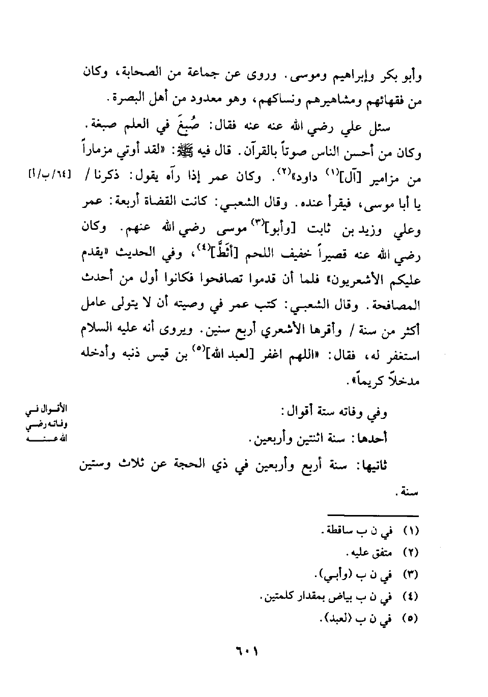 سئل علي رضي الله عنه عنه فقال: صُبغَ في العلم صبغة. وكان من أحسن الناس صوتًا بالقرآن. قال فيه - صلى الله عليه وسلم -: "لقد أوتي مزمارًا من مزامير [آل] (¬1) داود" (¬2). وكان عمر إذا رآه يقول: ذكرنا يا أبا موسى، فيقرأ عنده. وقال الشعبي: كانت القضاة أربعة: عمر وعلي وزيد بي ثابت [وأبو] (¬3) موسى رضي الله عنهم. وكان رضي الله عنه قصيرًا خفيف اللحم [أثَطَّ] (¬4)، وفي الحديث "يقدم عليكم الأشعريون" فلما أن قدموا تصافحوا فكانوا أول من أحدث المصافحة. وقال الشعبي: كنت عمر في وصيته أن لا يتولى عامل أكثر من سنة وأقرها الأشعري أربع سنين. ويروى أنه عليه السلام استغفر له، فقال: "اللهم اغفر [لعبد الله] (¬5) بن قيس ذنبه وأدخله مدخلًا كريمًا".
