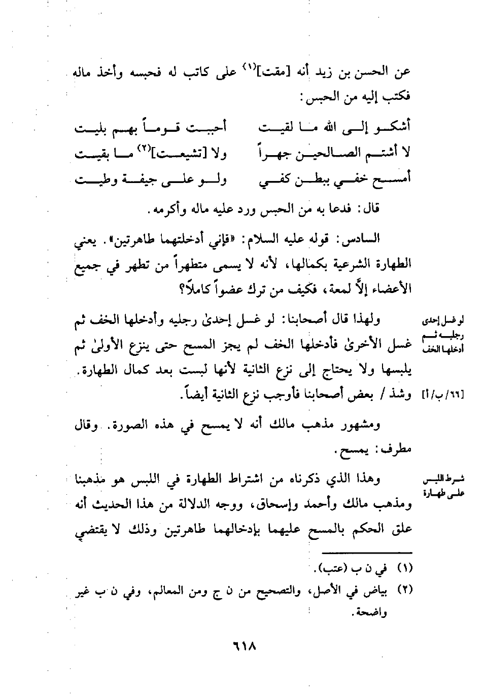 وهذا الذي ذكرناه من اشتراط الطهارة في اللبس هو مذهبنا ومذهب مالك وأحمد وإسحاق، ووجه الدلالة من هذا الحديث أنه علق الحكم بالمسح عليهما بإدخالهما طاهرتين وذلك لا يقتضي