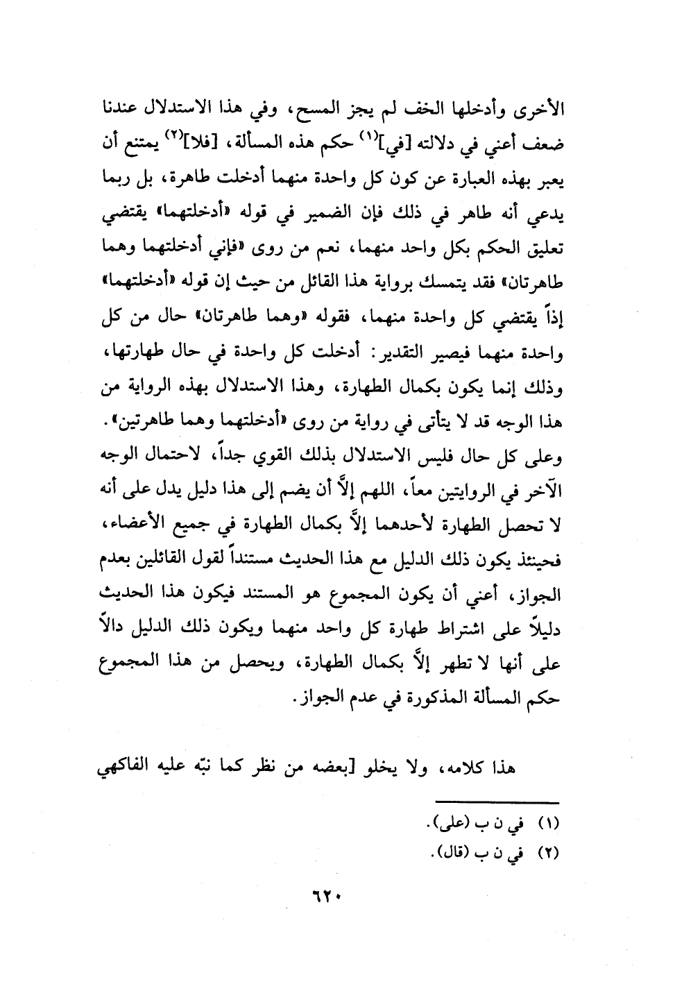 الأخرى وأدخلها الخف لم يجز المسح، وفي هذا الاستدلال عندنا ضعف أعني في دلالته [في] (1) حكم هذه المسألة، [فلا] (2) يمتنع أن يعبر بهذه العبارة عن كون كل واحدة منهما أدخلت طاهرة، بل ربما يدعي أنه طاهر في ذلك فإن الضمير في قوله "أدخلتهما" يقتضي تعليق الحكم بكل واحد منهما، نعم من روى "فإني أدخلتهما وهما طاهرتان" فقد يتمسك برواية هذا القائل من حيث إن قوله "أدخلتهما" إذًا يقتضي كل واحدة منهما، فقوله "وهما طاهرتان" حال من كل واحدة منهما فيصير التقدير: أدخلت كل واحدة في حال طهارتها، وذلك إنما يكون بكمال الطهارة، وهذا الاستدلال بهذه الرواية من هذا الوجه قد لا يتأتى في رواية من روى "أدخلتهما وهما طاهرتين".