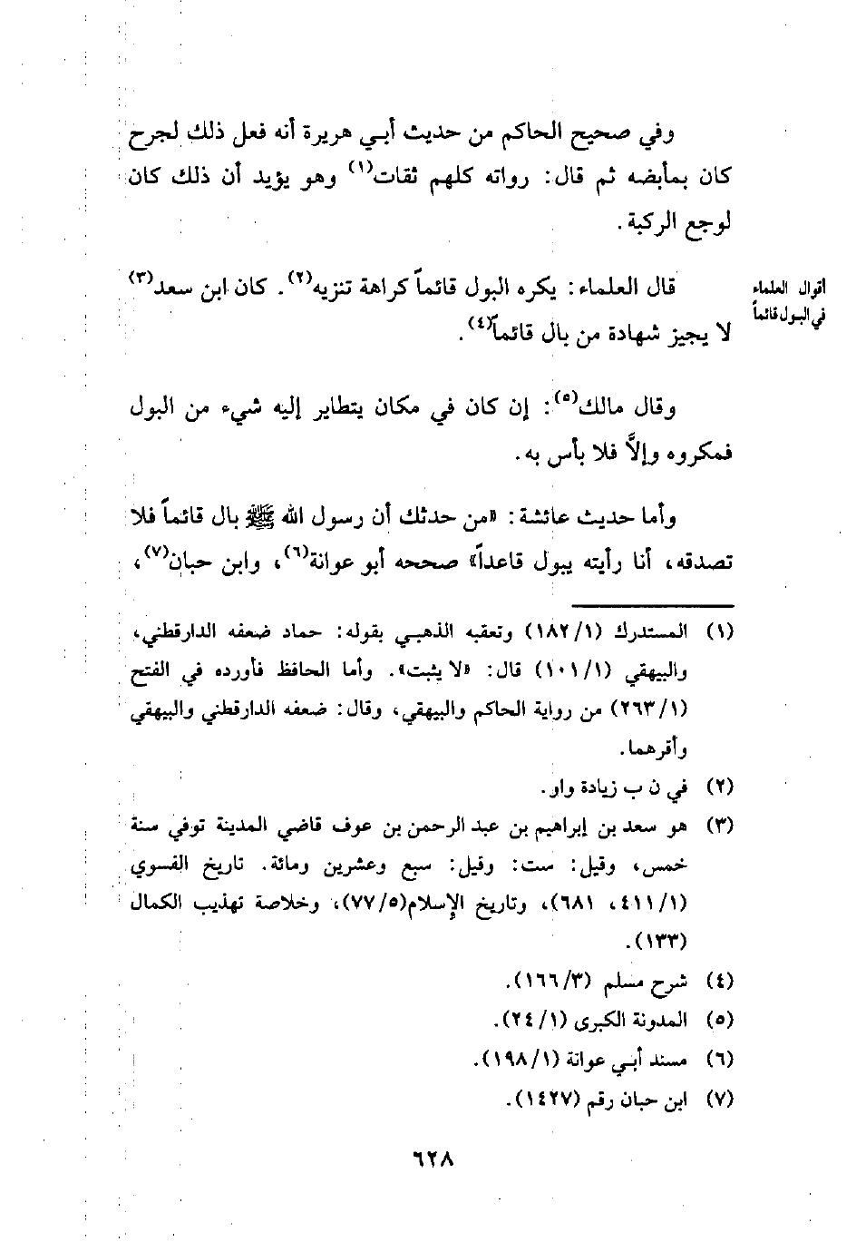 وأما حديث عائشة: "من حدثك أن رسول الله - صلى الله عليه وسلم - بال قائمًا فلا تصدقه، أنا رأيته يبول قاعدًا" صححه أبو عوانة (¬6)، وابن حبان (¬7)،