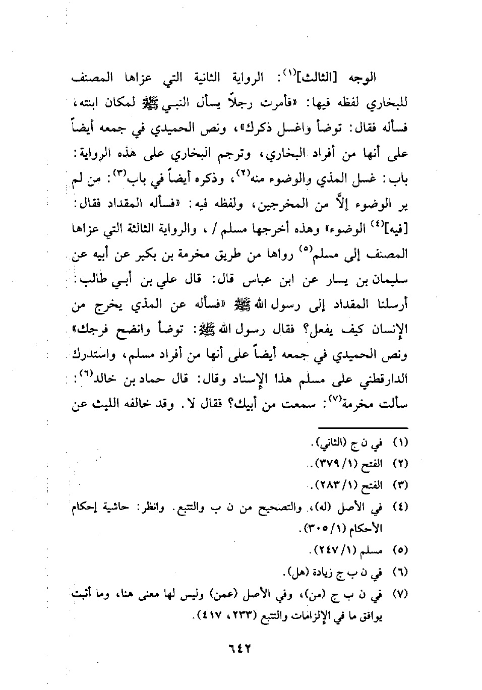 الوجه [الثالث] (¬1): الرواية الثانية التي عزاها المصنف للبخاري لفظه فيها: "فأمرت رجلًا يسأل النبي - صلى الله عليه وسلم - لمكان ابنته، فسأله فقال: توضأ واغسل ذكرك"، ونص الحميدي في جمعه أيضًا على أنها من أفراد البخاري، وترجم البخاري على هذه الرواية: باب: غسل المذي والوضوء منه (¬2)، وذكره أيضًا في باب (¬3): من لم ير الوضوء إلَّا من المخرجين، ولفظه فيه: "فسأله المقداد فقال: [فيه] (¬4) الوضوء" وهذه أخرجها مسلم، والرواية الثالثة التي عزاها المصنف إلى مسلم (¬5) رواها من طريق مخرمة بن بكير عن أبيه عن سليمان بن يسار عن ابن عباس قال: قال علي بن أبي طالب: أرسلنا المقداد إلى رسول الله - صلى الله عليه وسلم - "فسأله عن المذي يخرج من الإِنسان كيف يفعل؟ فقال رسول الله - صلى الله عليه وسلم -: توضأ وانضح فرجك" ونص الحميدي في جمعه أيضًا على أنها من أفراد مسلم، واستدرك الدارقطني على مسلم هذا الإِسناد وقال: قال حماد بن خالد (¬6): سألت مخرمة (¬7): سمعت من أبيك؟ فقال لا. وقد خالفه الليث عن