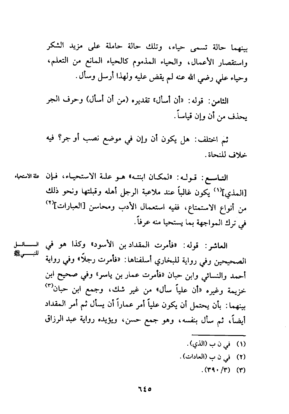 التاسع: قوله: "لمكان ابنته" هو علة الاستحياء، فإن [المذي] (¬1) يكون غالبًا عند ملاعبة الرجل أهله وقبلتها ونحو ذلك من أنواع الاستمتاع، ففيه استعمال الأدب ومحاسن [العبارات] (¬2) في ترك المواجهة بما يستحيا منه عرفًا.
