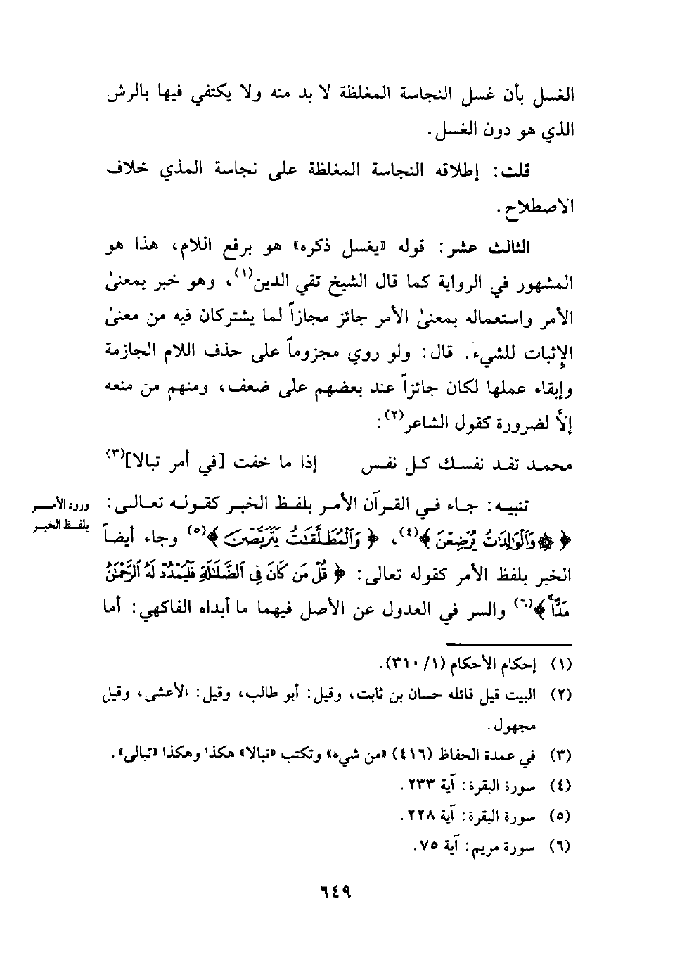 الثالث عشر: قوله "يغسل ذكره" هو برفع اللام، هذا هو المشهور في الرواية كما قال الشيخ تقي الدين (¬1)، وهو خبر بمعنى الأمر واستعماله بمعنى الأمر جائز مجازًا لما يشتركان فيه من معنى الإِثبات للشيء. قال: ولو روي مجزومًا على حذف اللام الجازمة وإبقاء عملها لكان جائزًا عند بعضهم على ضعف، ومنهم من منعه إلَّا لضرورة كقول الشاعر (¬2):
