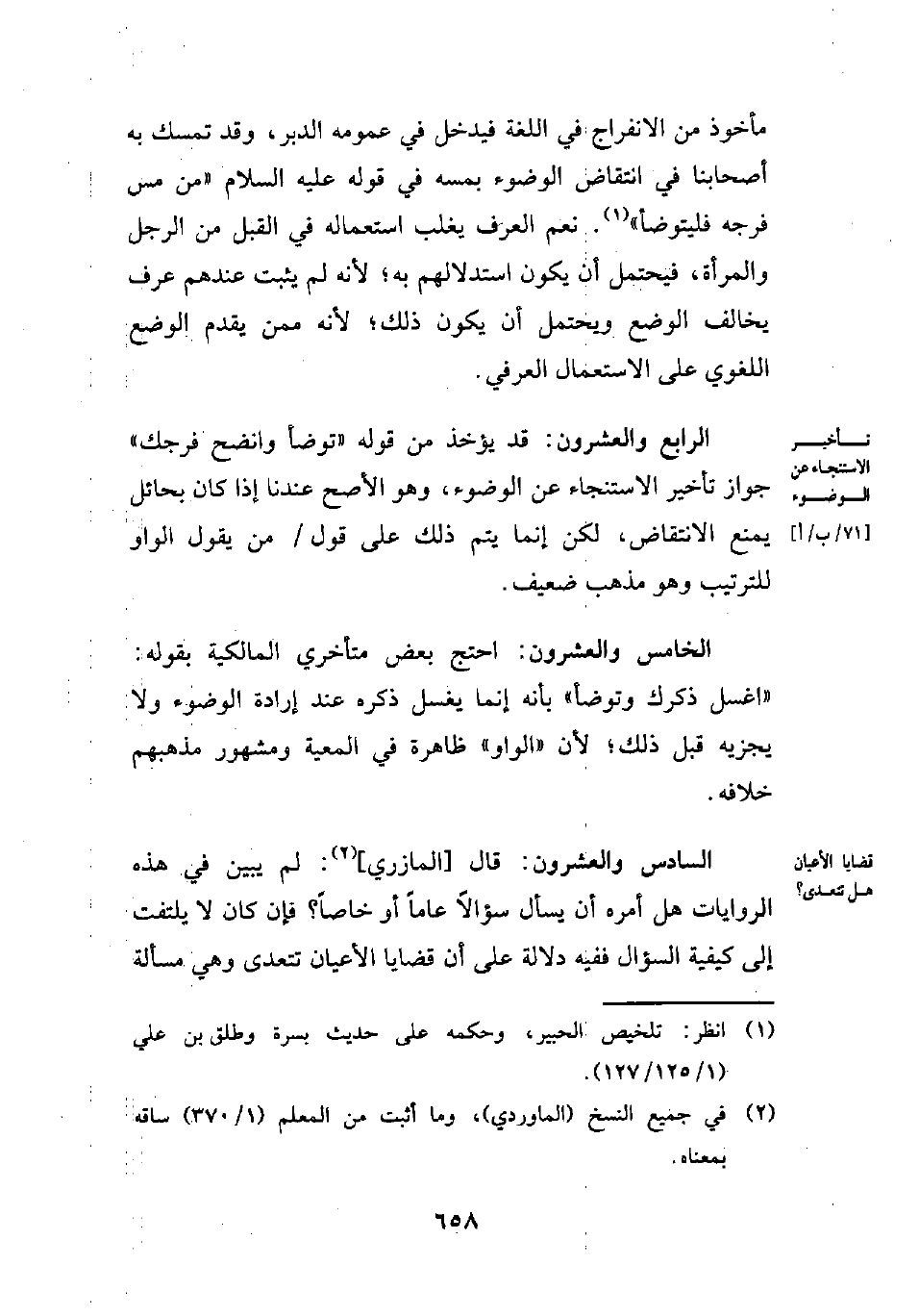 الخامس والعشرون: احتج بعض متأخري المالكية بقوله: "اغسل ذكرك وتوضأ" بأنه إنما يغسل ذكره عند إرادة الوضوء ولا يجزيه قبل ذلك؛ لأن "الواو" ظاهرة في المعية ومشهور مذهبهم خلافه.