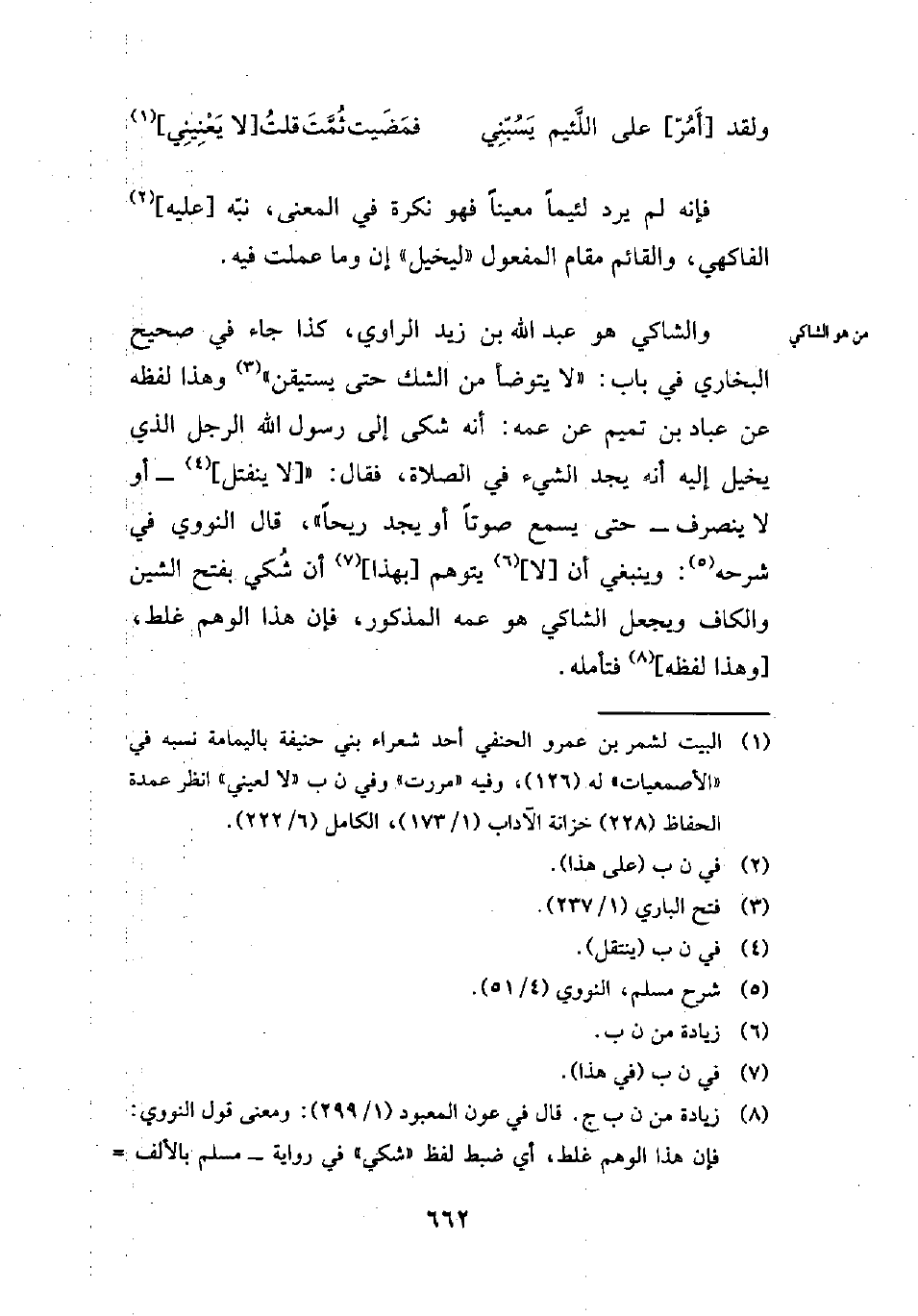 والشاكي هو عبد الله بن زيد الراوي، كذا جاء في صحيح البخاري في باب: "لا يتوضأ من الله حتى يستيقن" (¬3) وهذا لفظه عن عباد بن تميم عن عمه: أنه شكى إلى رسول الله الرجل الذي يخيل إليه أنه يجد الشيء في الصلاة، فقال: " [لا ينفتل] (¬4) -أو لا ينصرف- حتى يسمع صوتًا أو يجد ريحًا"، قال النووي في شرحه (¬5): وينبغي أن [لا] (¬6) يتوهم [بهذا] (¬7) أن شُكى بفتح الشين والكاف ويجعل الشاكي هو عمه المذكور، فإن هذا الوهم غلط، [وهذا لفظه] (¬8) فتأمله.
