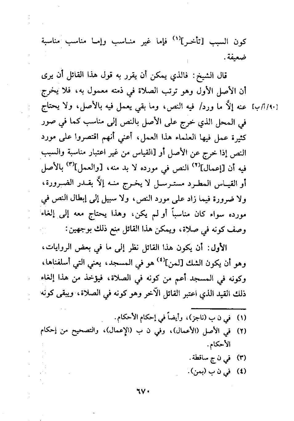 قال الشيخ: فالذي يمكن أن يقرر به قول هذا القائل أن يرى أن الأصل الأول وهو ترتب الصلاة في ذمته معمول به، فلا يخرج عنه إلَّا ما ورد فيه النص، وما بقي يعمل فيه بالأصل، ولا يحتاج في المحل الذي خرج على الأصل بالنص إلى مناسب كما في صور كثيرة عمل فيها العلماء هذا العمل، أعني أنهم اقتصروا على مورد النص إذا خرج عن الأصل أو [القياس من غير اعتبار مناسبة والسبب فيه أن [إعمال] (¬2) النص في مورده لا بد منه، [والعمل] (¬3) بالأصل أو القياس المطرد مسترسل لا يخرج منه إلَّا بقدر الضرورة، ولا ضرورة فيما زاد على مورد النص، ولا سبيل إلى إبطال النص في مورده سواء كان مناسبًا أو لم يكن، وهذا يحتاج معه إلى إلغاء وصف كونه في صلاة، ويمكن هذا القائل منع ذلك بوجهين: