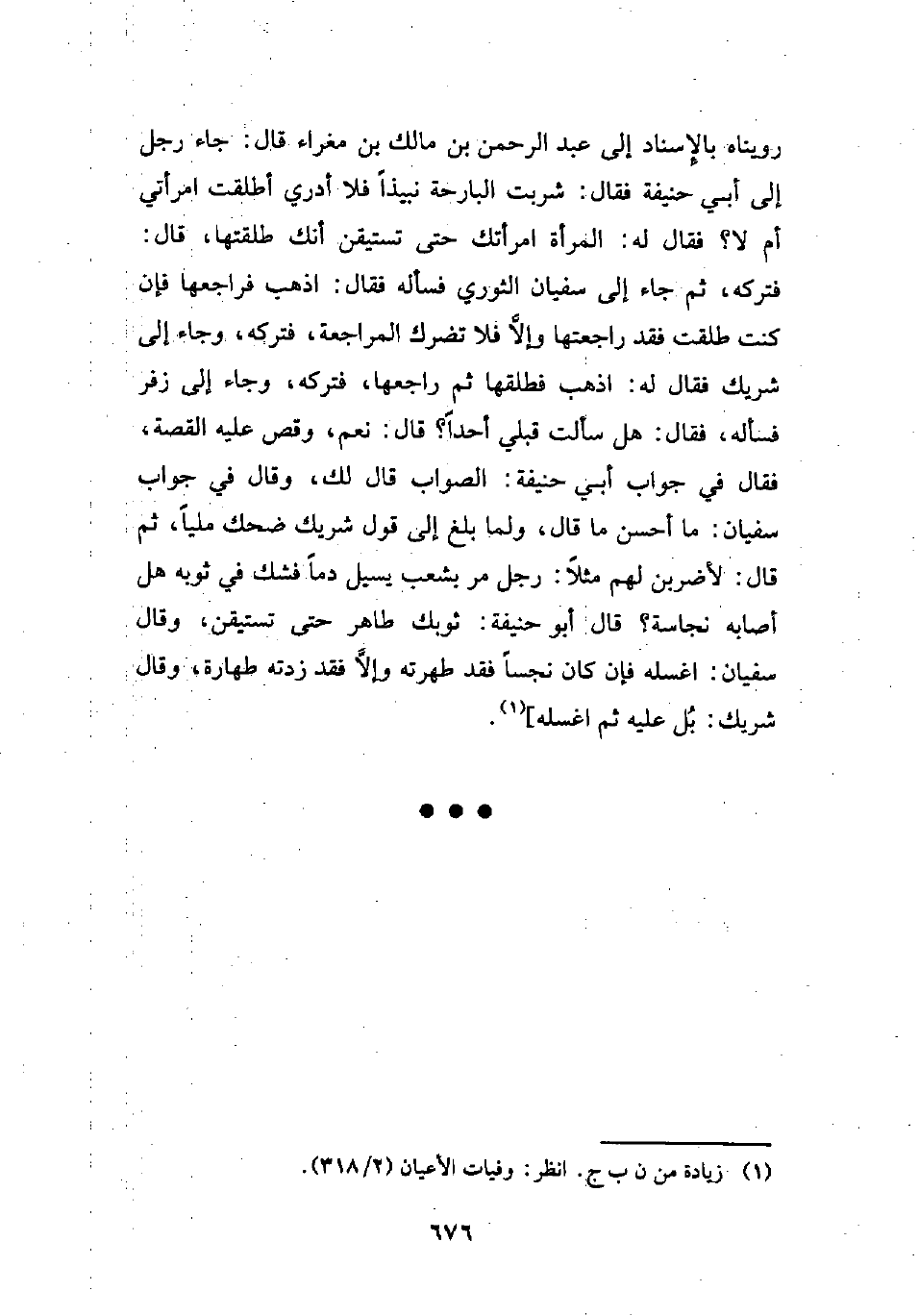 رويناه بالإِسناد إلى عبد الرحمن بن مالك بن مغراء قال: جاء رجل إلى أبي حنيفة فقال: شربت البارحة نبيذًا فلا أدري أطلقت امرأتي أم لا؟ فقال له: المرأة امرأتك حتى تستيقن أنك طلقتها، قال: فتركه، ثم جاء إلى سفيان الثوري فسأله فقال: اذهب فراجعها فإن كنت طلقت فقد راجعتها وإلَّا فلا تضرك المراجعة، فتركه، وجاء إلى شريك فقال له: اذهب فطلقها ثم راجعها، فتركه، وجاء إلى زفر فسأله، فقال: هل سألت قبلي أحدًا؟ قال: نعم، وقص عليه القصة، فقال في جواب أبي حنيفة: الصواب قال لك، وقال في جواب سفيان: ما أحسن ما قال، ولما بلغ إلى قول شريك ضحك مليًا، ثم قال: لأضربن لهم مثلًا: رجل مرة بشعب يسيل دمًا فشك في ثوبه هل أصابه نجاسة؟ قال أبو حنيفة: ثوبك طاهر حتى تستيقن، وقال سفيان: اغسله فإن كان نجسًا فقد طهرته وإلَّا فقد زدته طهارة، وقال شريك: بُل عليه ثم اغسله] (¬1).