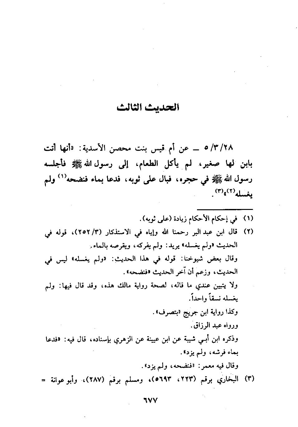 28/ 3/ 5 - عن أم قيس بنت محصن الأسدية: "أنها أتت بابن لها صغير، لم يأكل الطعام، إلى رسول الله - صلى الله عليه وسلم - فأجلسه رسول الله - صلى الله عليه وسلم - في حجره، فبال على ثوبه، فدعا بماء فنضحه (¬1) ولم يغسله (¬2) " (¬3).