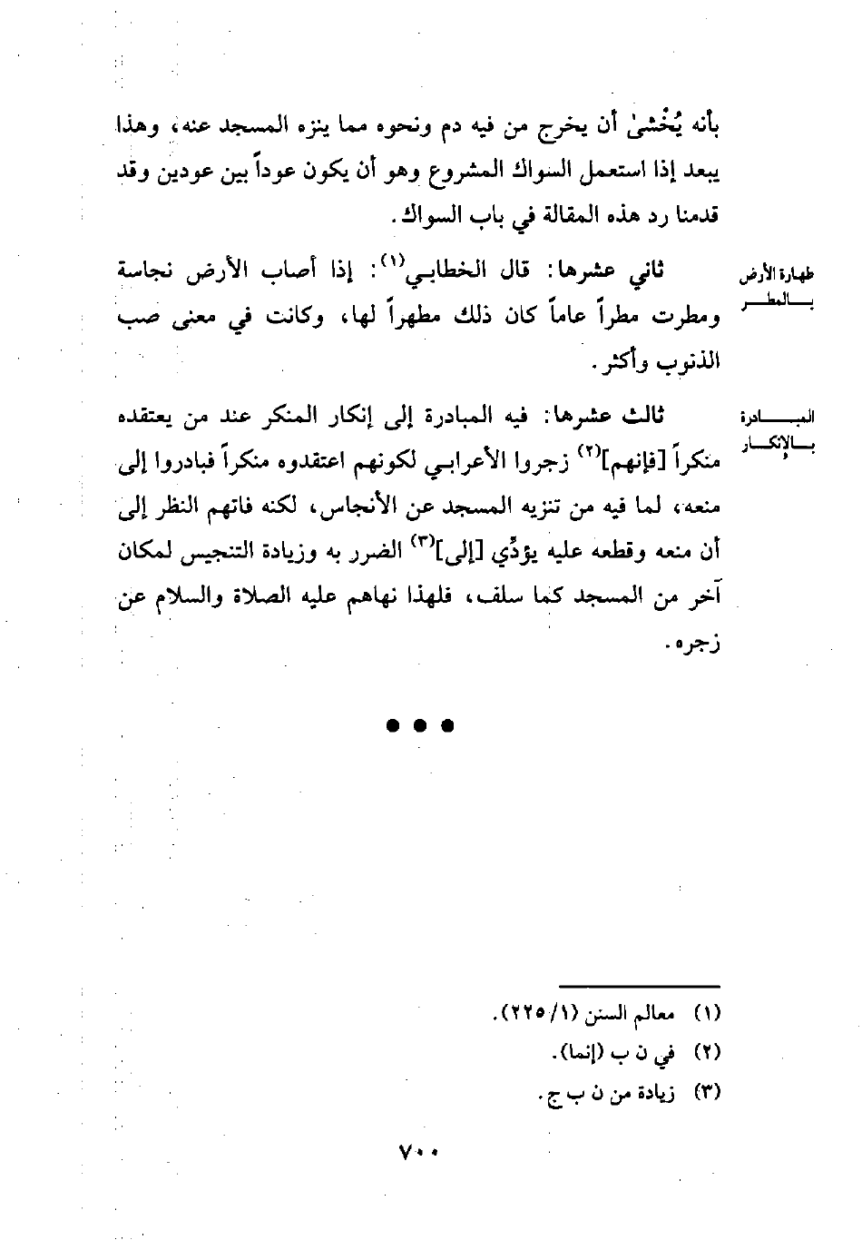 ثالث عشرها: فيه المبادرة إلى إنكار المنكر عند من يعتقده منكرًا [فإنهم] (¬2) زجروا الأعرابي لكونهم اعتقدوه منكرًا فبادروا إلى منعه، لما فيه من تنزيه المسجد عن الأنجاس، لكنه فاتهم النظر إلى أن منعه وقطعه عليه يؤدِّي [إلي] (¬3) الضرر به وزيادة التنجيس لمكان آخر من المسجد كما سلف، فلهذا نهاهم عليه الصلاة والسلام عن زجره.