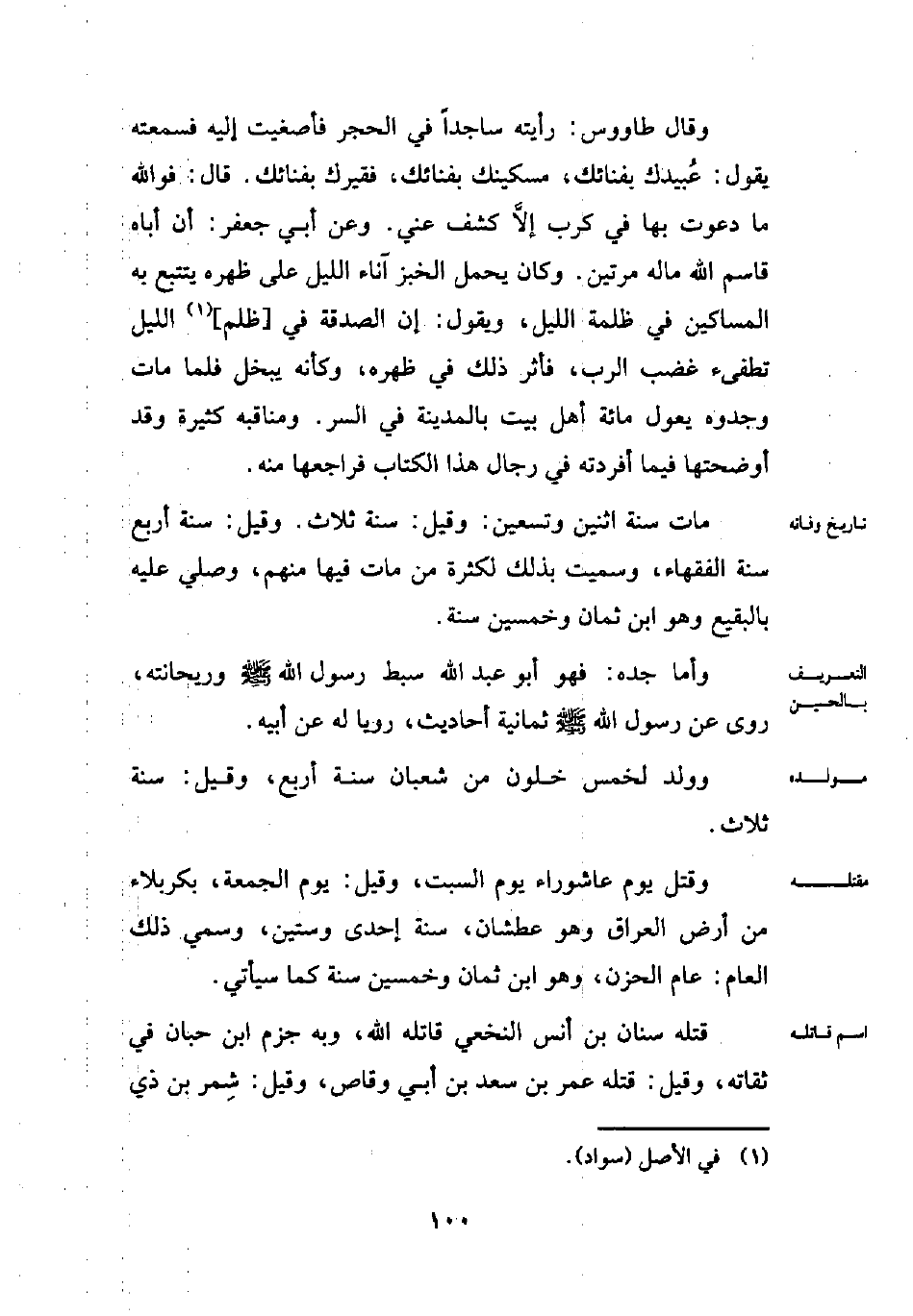 وقال طاووس: رأيته ساجدًا في الحجر فأصغيت إليه فسمعته يقول: عُبيدك بفنائك، مسكينك بفنائك، فقيرك بفنائك. قال: فوالله ما دعوت بها في كرب إلَّا كشف عني. وعن أبي جعفر: أن أباه قاسم الله ماله مرتين. وكان يحمل الخبز آناء الليل على ظهره يتتبع به المساكين في ظلمة الليل، ويقول: إن الصدقة في [ظلم] (¬1) الليل تطفئ غضب الشرب، فأثر ذلك في ظهره، وكأنه يبخل فلما مات وجدوه يعول مائة أهل بيت بالمدينة في السر. ومناقبه كثيرة وقد أوضحتها فيما أفردته في رجال هذا الكتاب فراجعها منه.