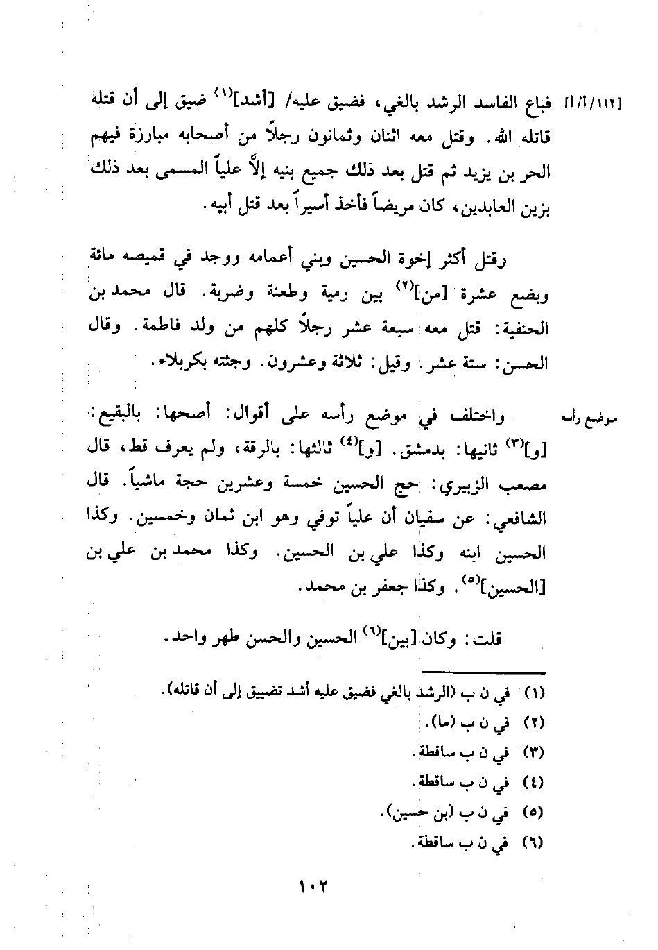 فباع الفاسد الرشد بالغي، فضيق عليه [أشد] (¬1) ضيق إلى أن قتله قاتله الله. وقتل معه اثنان وثمانون رجلًا من أصحابه مبارزة فيهم الحر بن يزيد ثم قتل بعد ذلك جميع بنيه إلَّا عليًا المسمى بعد ذلك بزين العابدين، كان مريضًا فأخذ أسيرًا بعد قتل أبيه.