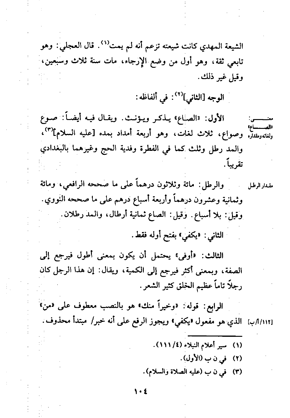 الأول: "الصاع" يذكر ويؤنث. ويقال فيه أيضًا: صوع وصواع، ثلاث لغات، وهو أربعة أمداد بمده [عليه السلام] (¬3)، والمد رطل وثلث كما في الفطرة وفدية الحج وغيرهما بالبغدادي تقريبًا.
